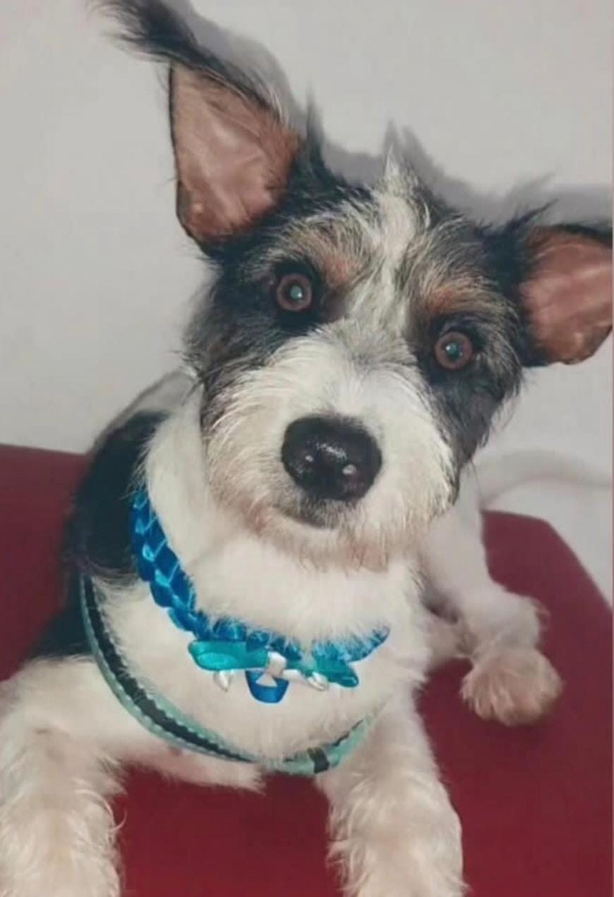 ✅ Es un perrito pequeño, blanco con negro, de ojos color café claro, tiene pecas y mechones de pelo café, es muy juguetón. Está recién operado todavía tiene los puntos de la cirugía.