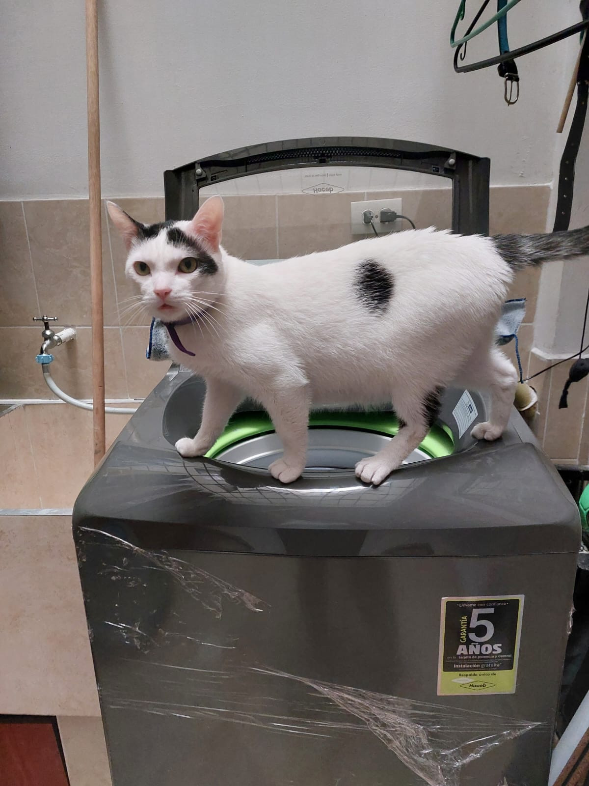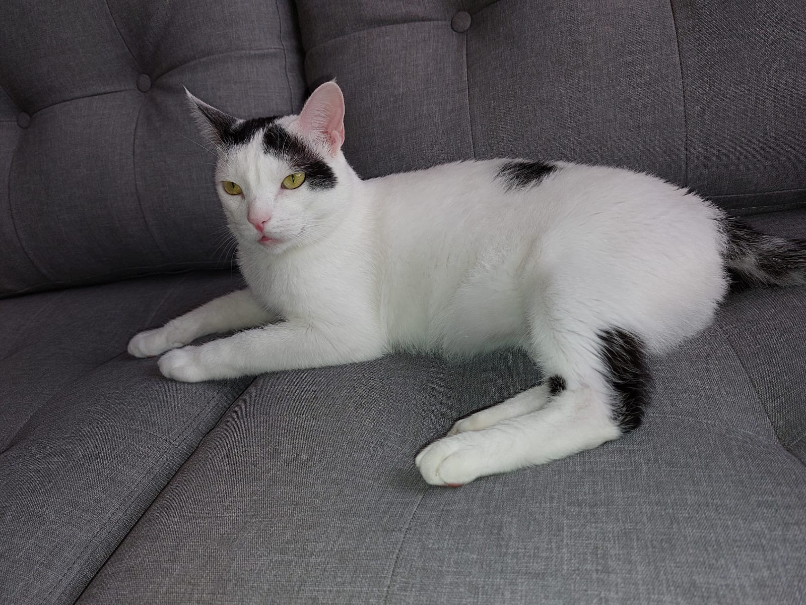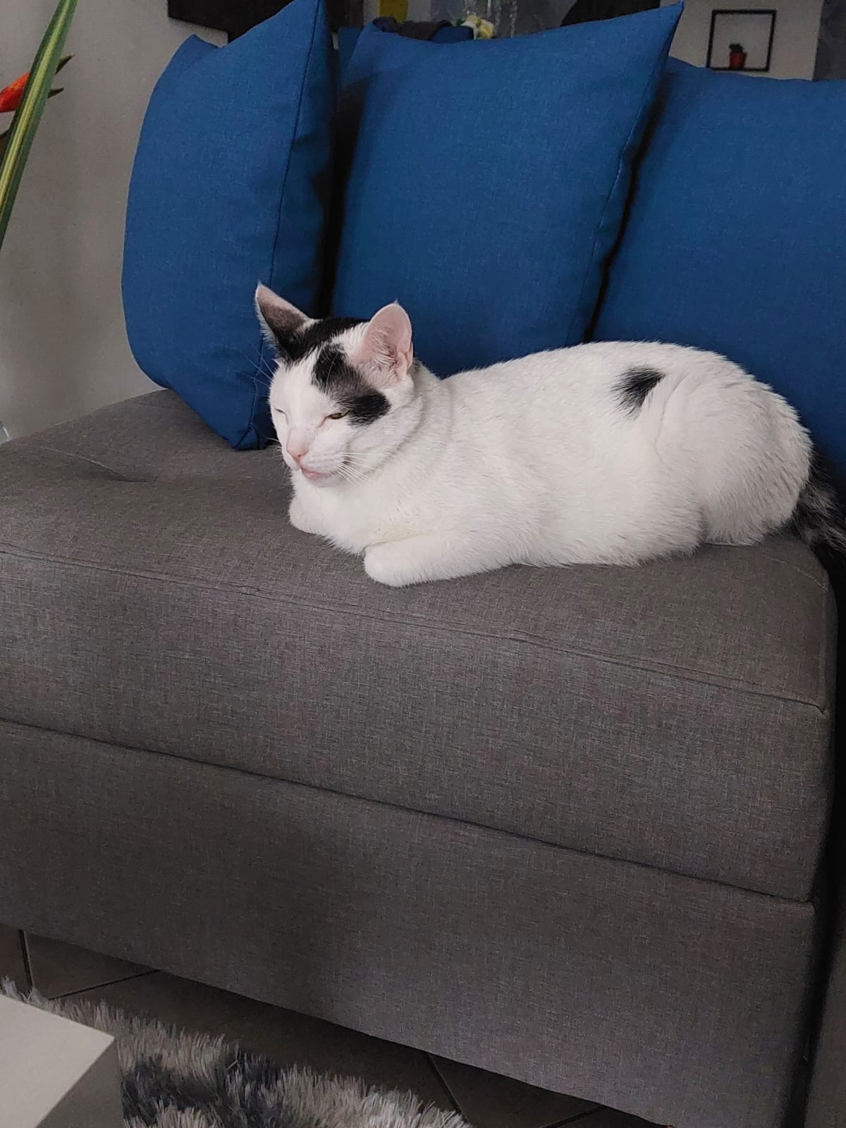 ✅ Es un gatito blanco, tiene en las orejas manchas negras y la cola es toda negra y tiene una mancha en una patica.