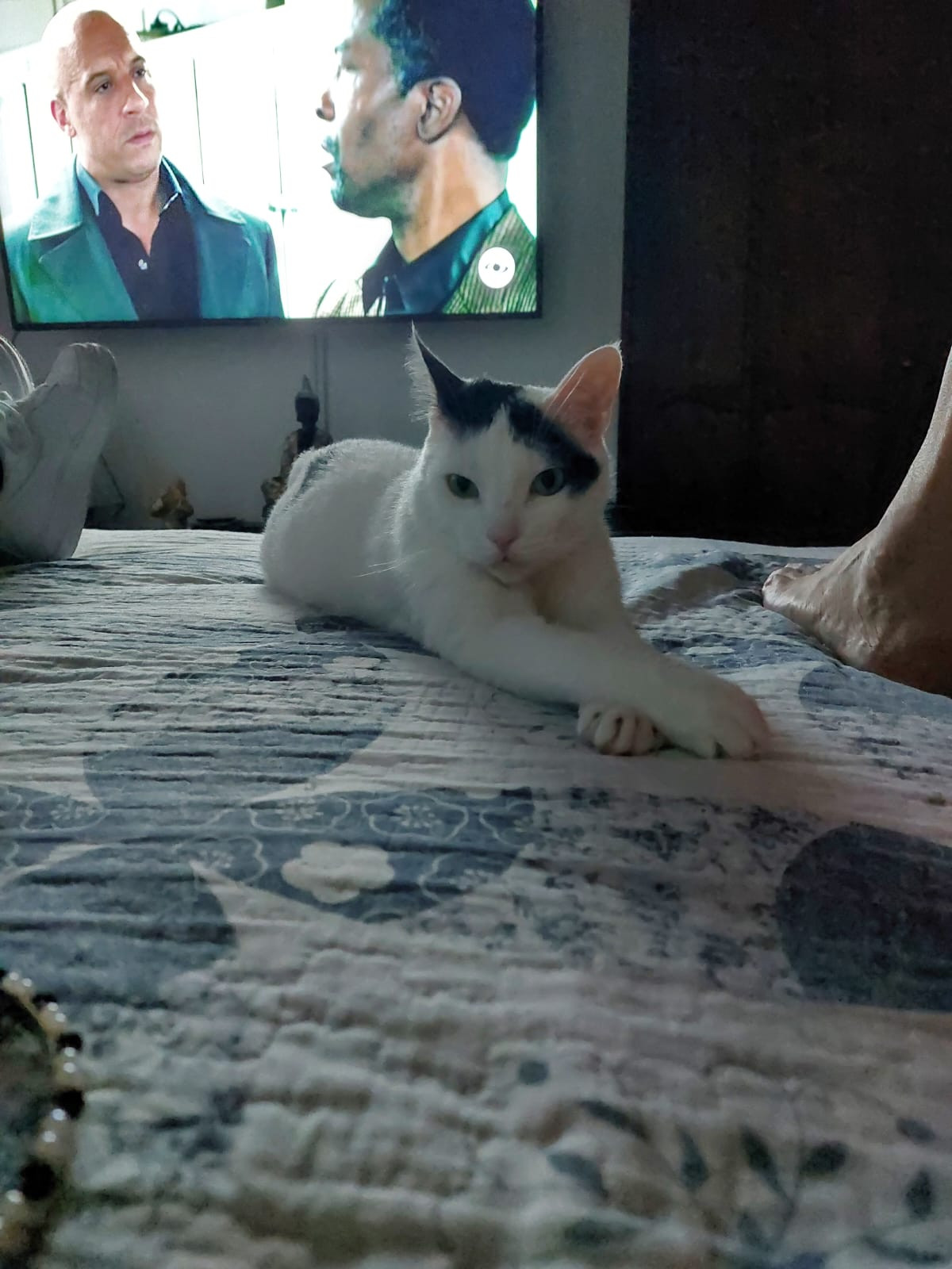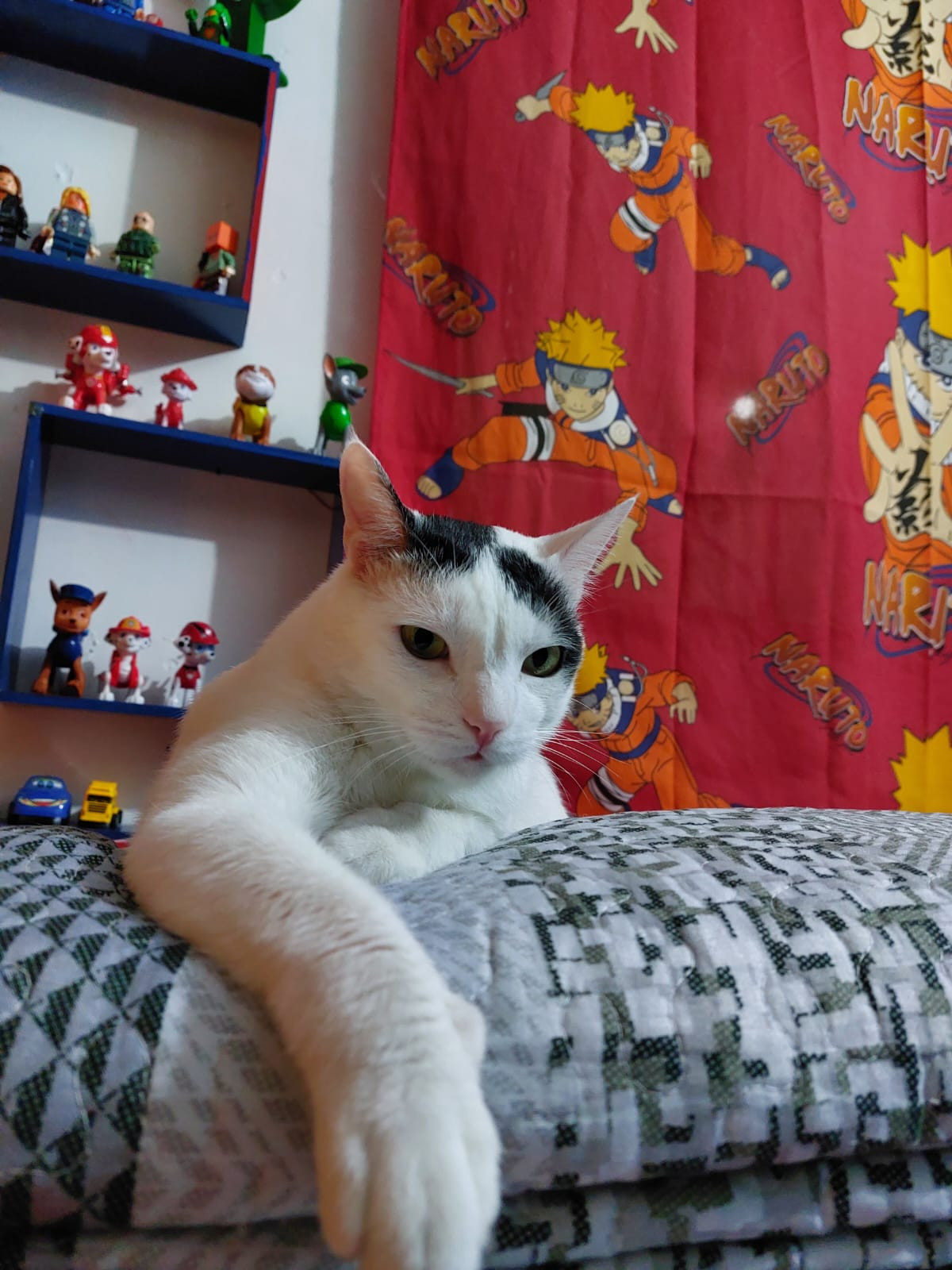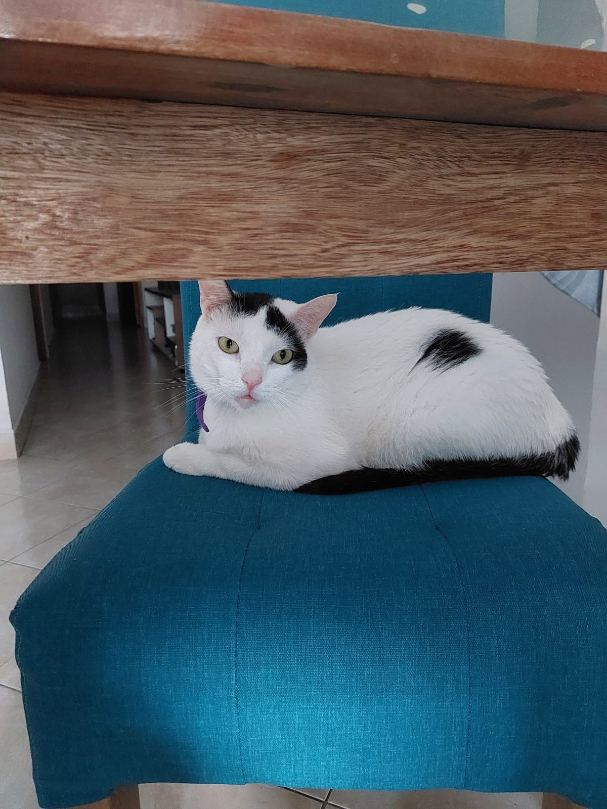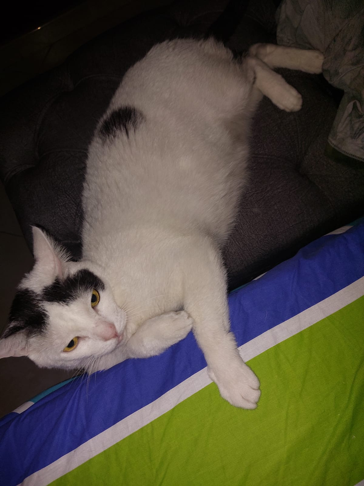 ✅ Es un gatito blanco, tiene en las orejas manchas negras y la cola es toda negra y tiene una mancha en una patica.