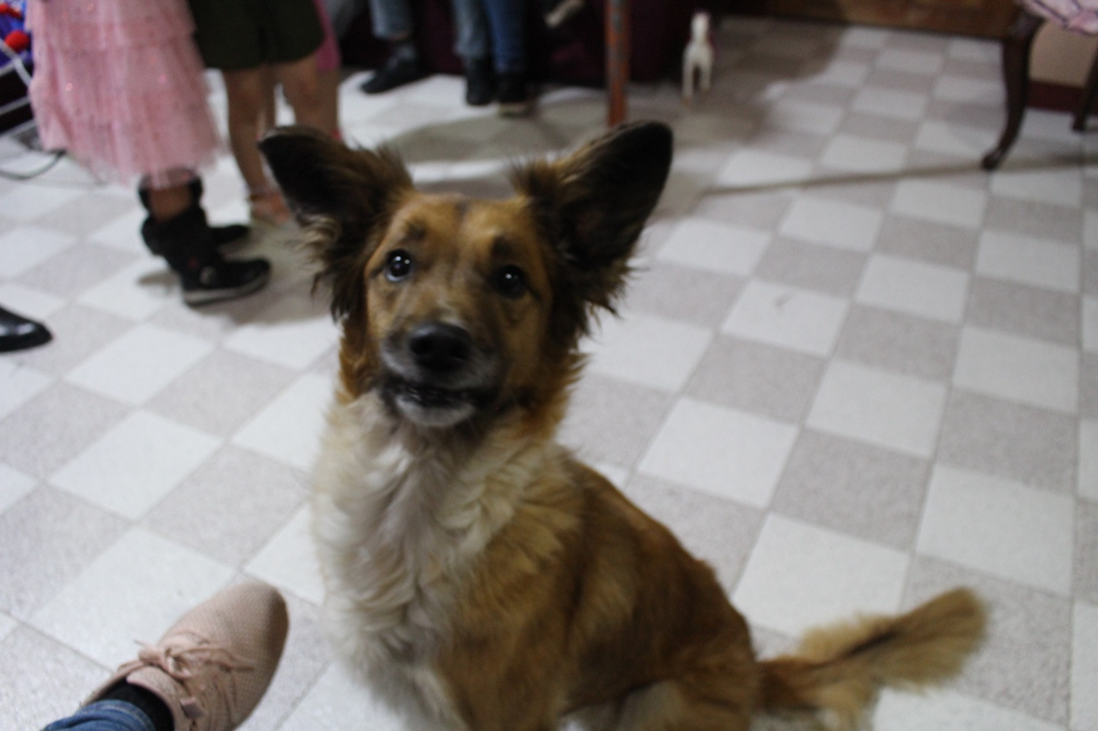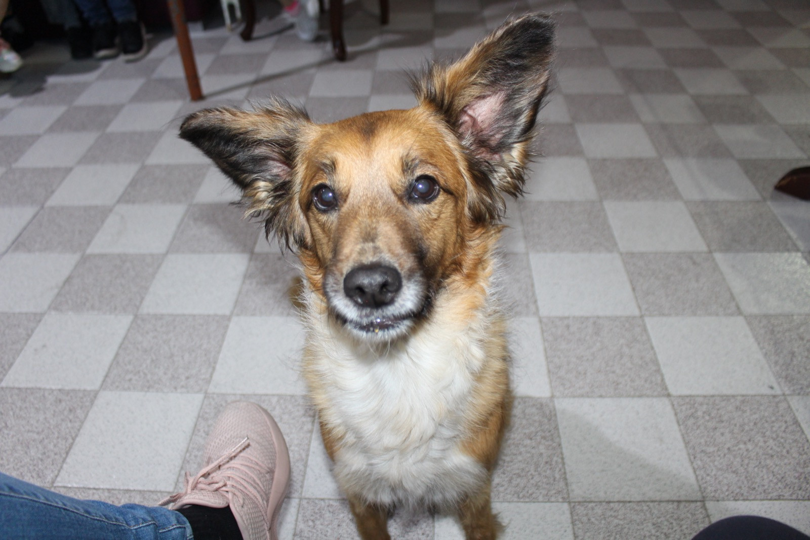 ✅ Es una perrita mediana, con orejas grandes, color amarillo y pecho blanco.