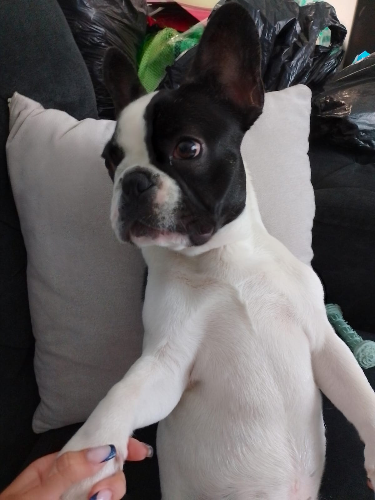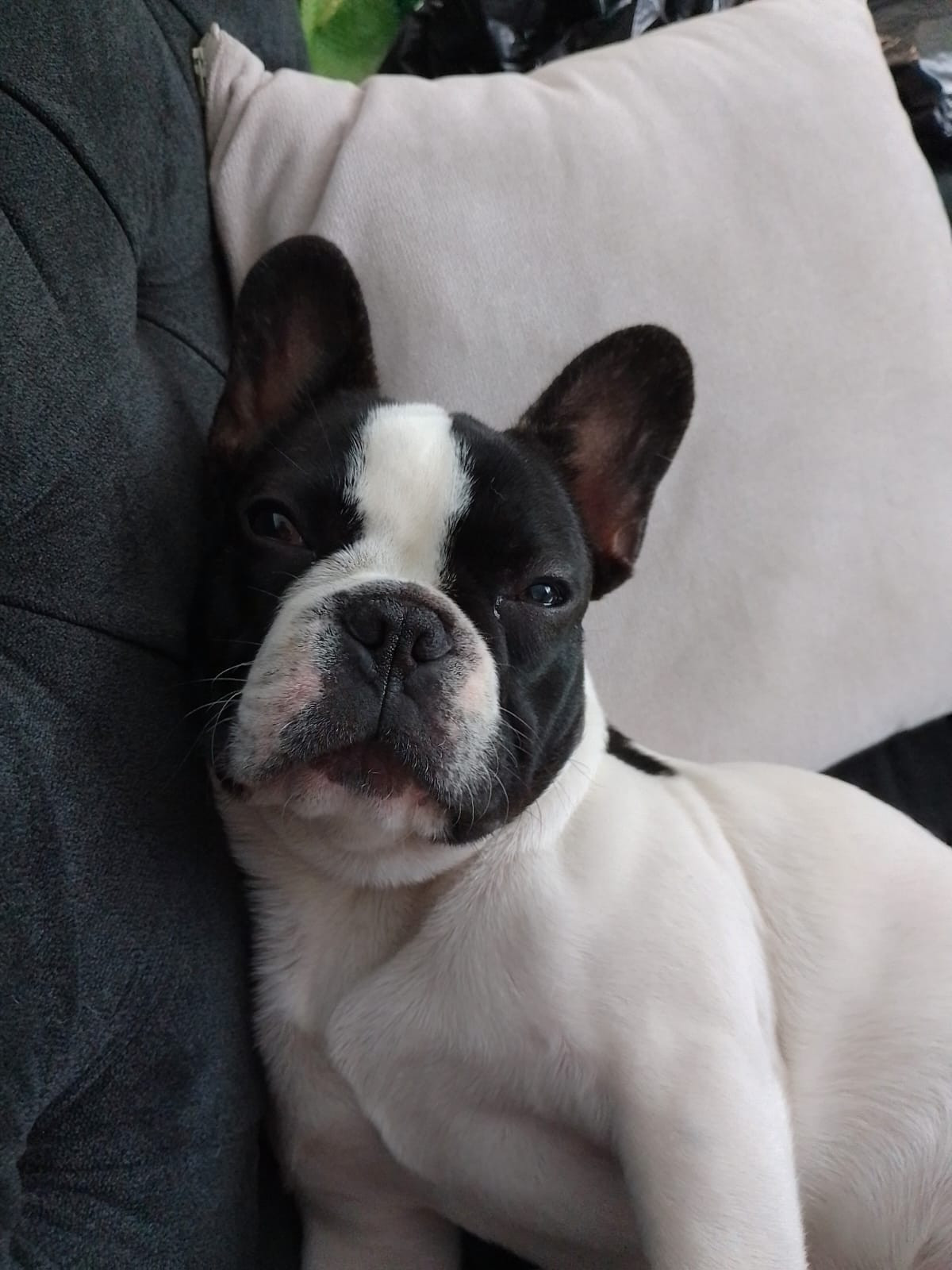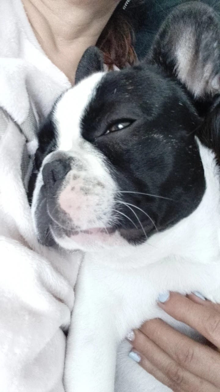 ✅ Es un perrito, macho, raza Bulldog Francés, es de color blanco con negro y sus orejitas son negras.