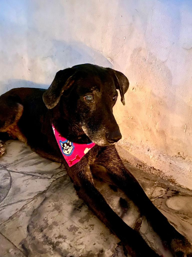 ✅ Sacha una perrita criolla, mediana, negra con muchas canas blancas en el pecho y en la cara, tiene un ojito con catarata se le ve casi blanco, tiene ocho años, esta viejita, casi no ve bien.