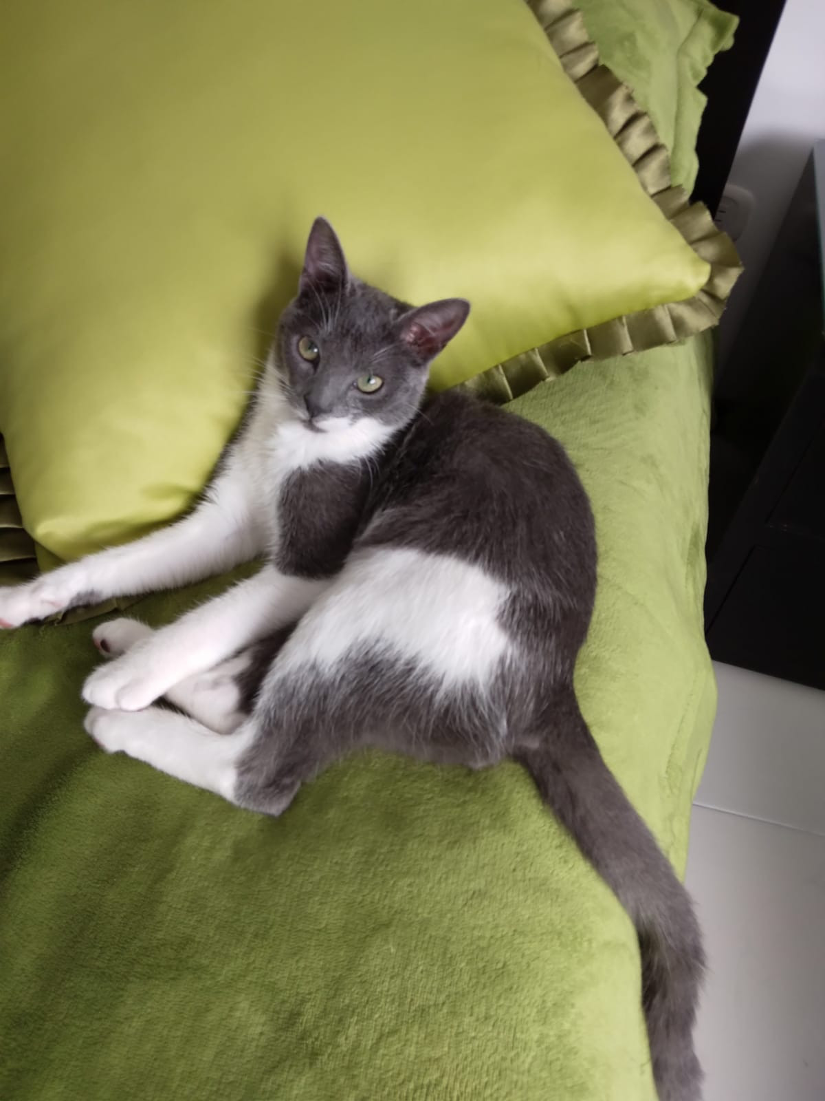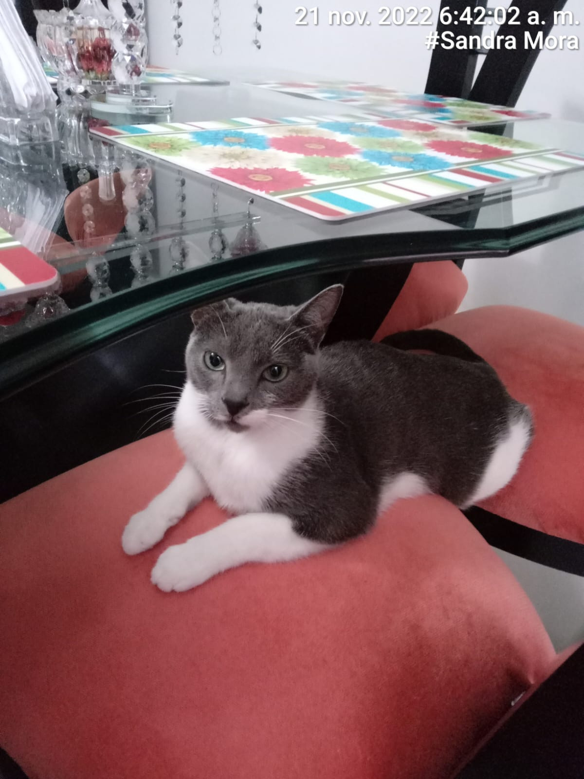 ✅ Es un gato de carita gris oscuro , ojos verdes claros, nariz gris, franja blanca delgada entre nariz y boca, mentón gris, lomo y cola gris oscuro, pecho y paticas blancas.