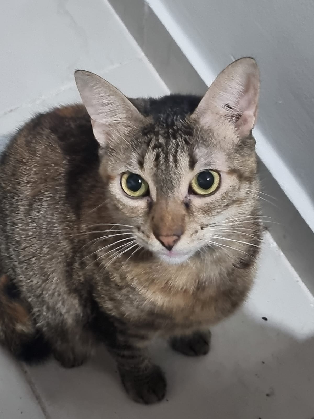 ✅ Es una gatita color pardo de jos verdes grandes, el colmillo izquierdo está partido. Tiene tres años de edad y está esterilizada