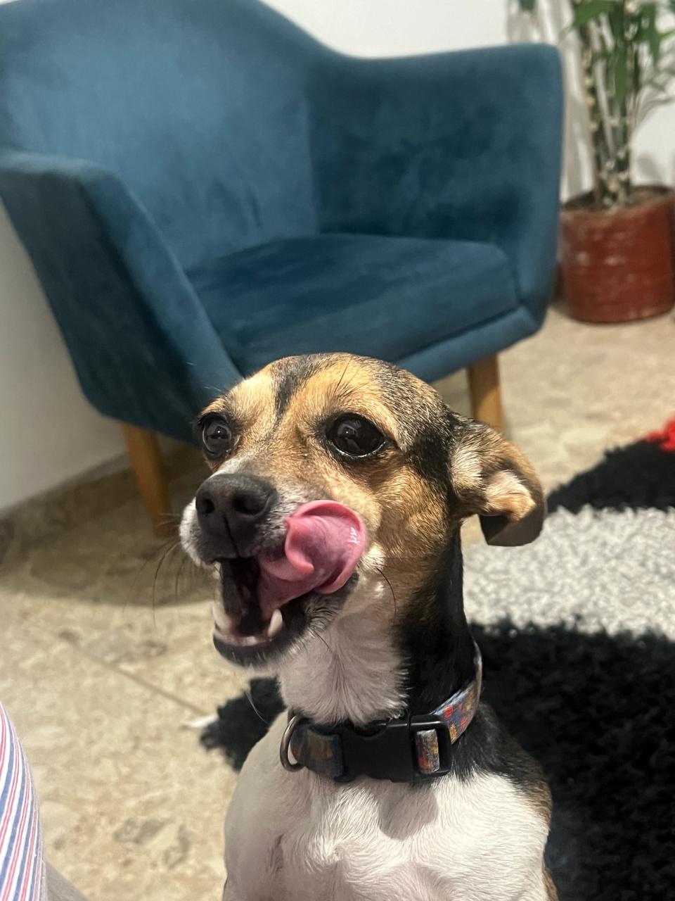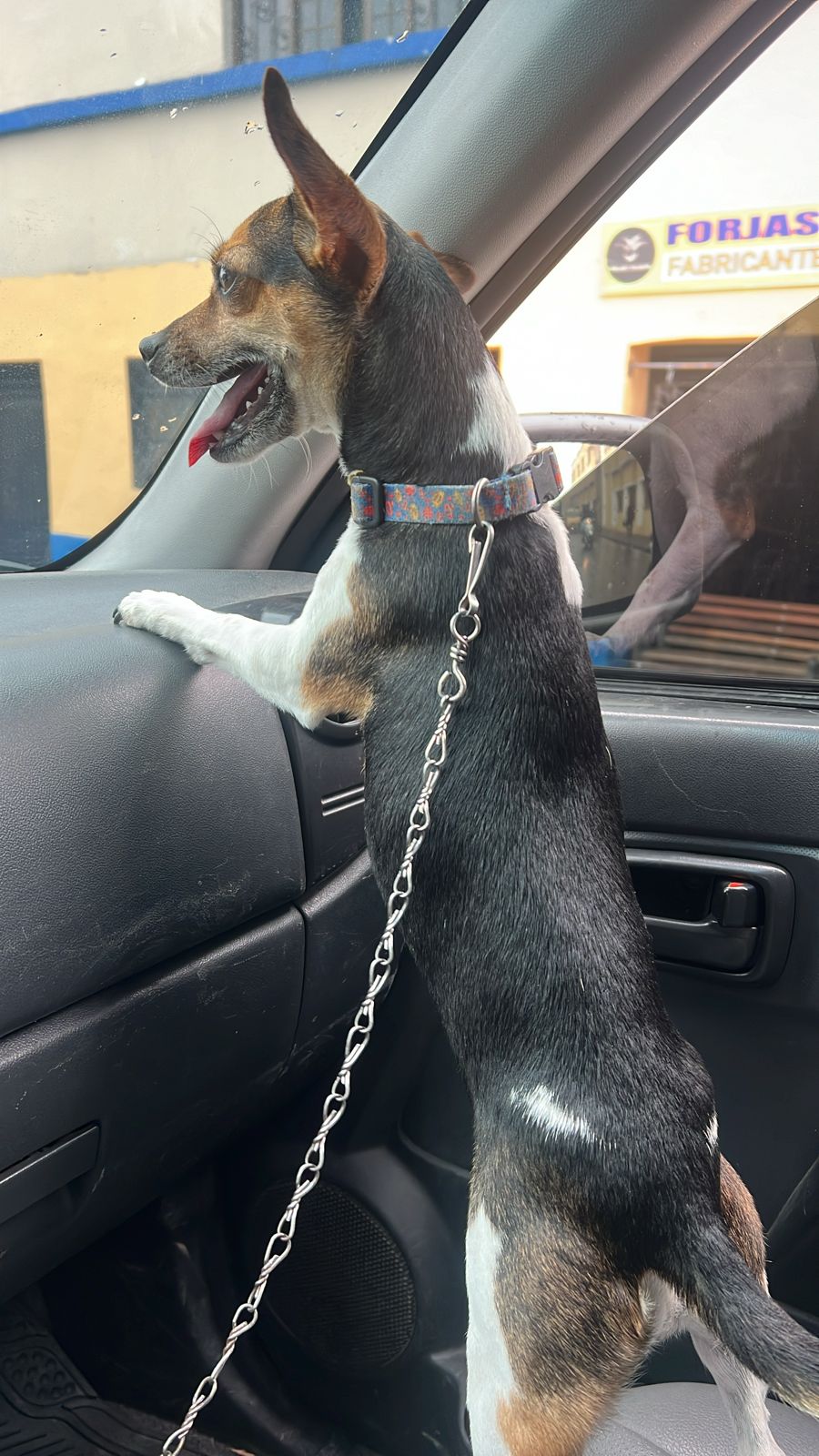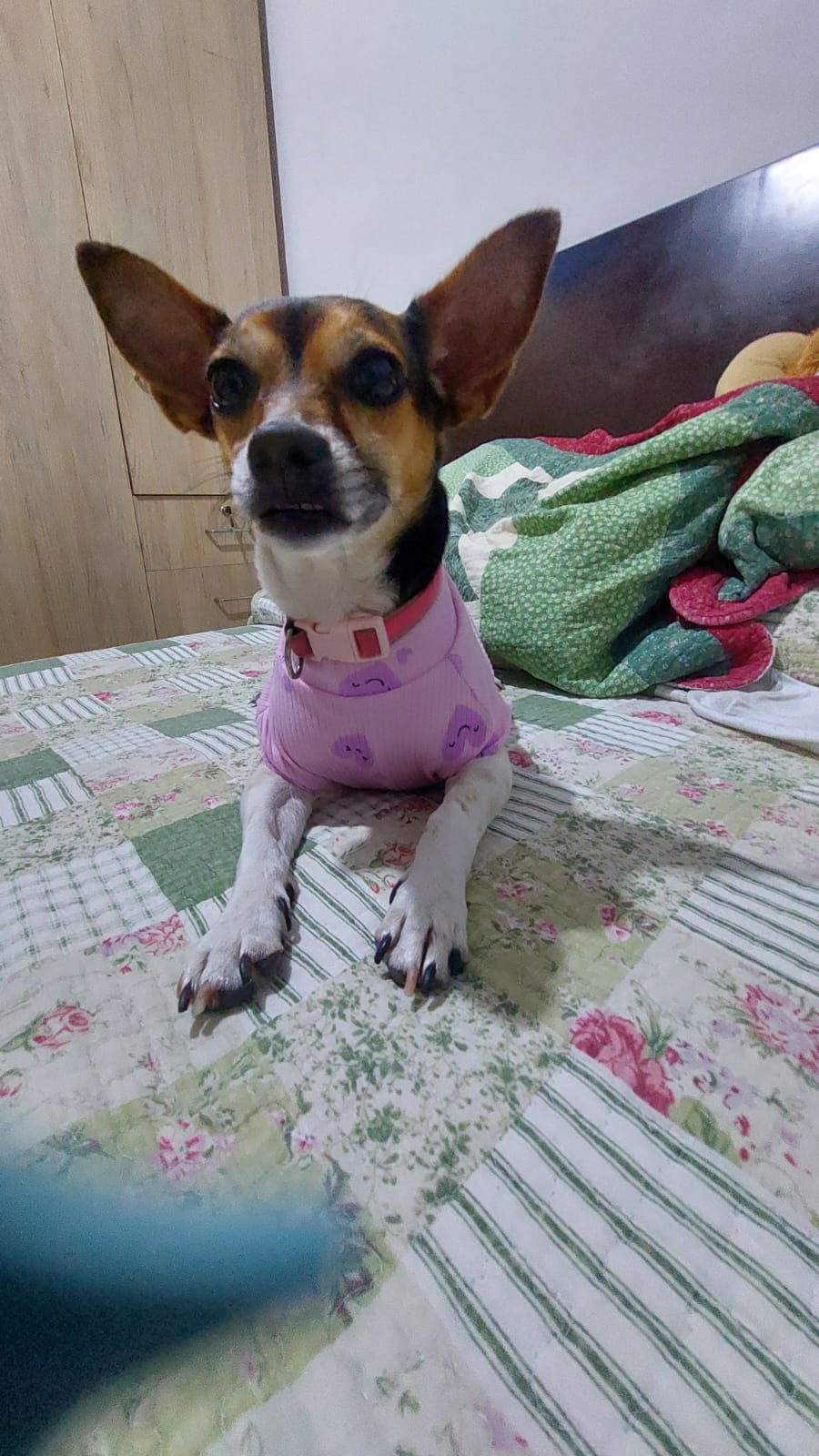 ✅ Es una perrita pequeña de color cafe con blanco y negro, patas blancas. Está esterilizada.