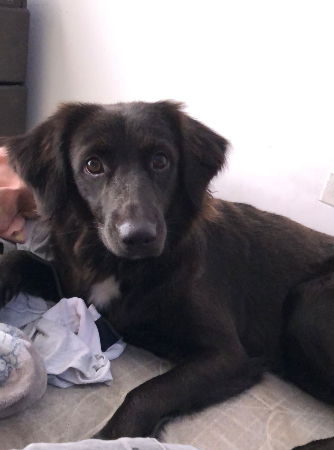 ✅ Es una perrita negra, peluda, tiene una mancha blanca en el pecho. Tiene 3 años de edad y está esterilizada.