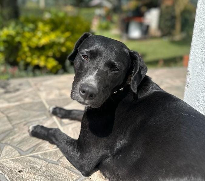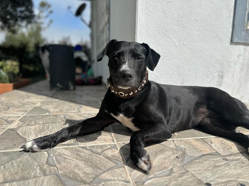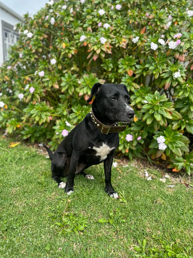 ✅ Es una perrita negra, grande, robusta, con manchas blancas en la nariz, en el pecho y en las patitas delanteras y traseras. Tiene aprox entre 6 y 7 años de edad y está esterilizada.