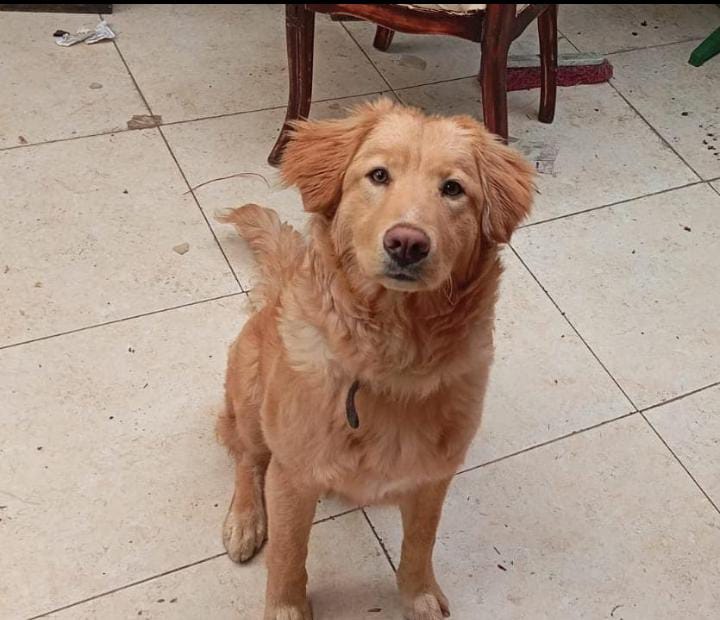 ✅ Es un Golden cachorro, es alto de color amarillo/dorado, es peludo su nariz es rosada y sus orejas son de tamaño mediano y tiene ojitos negros. Tiene 1 año y 6 meses de edad
