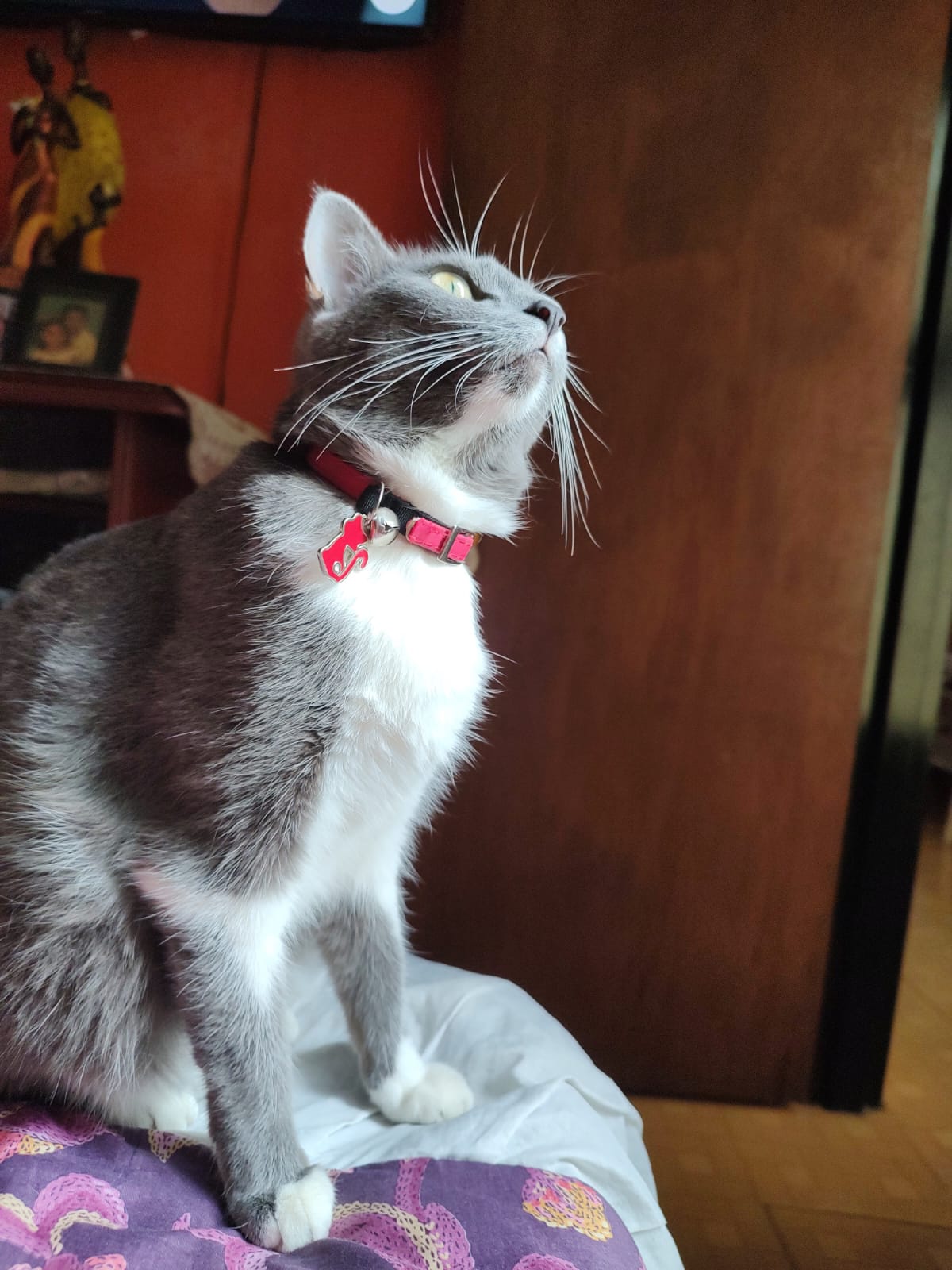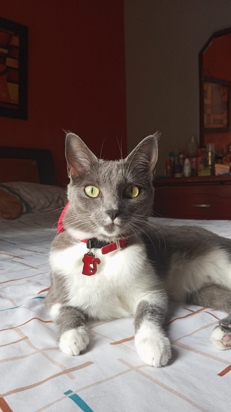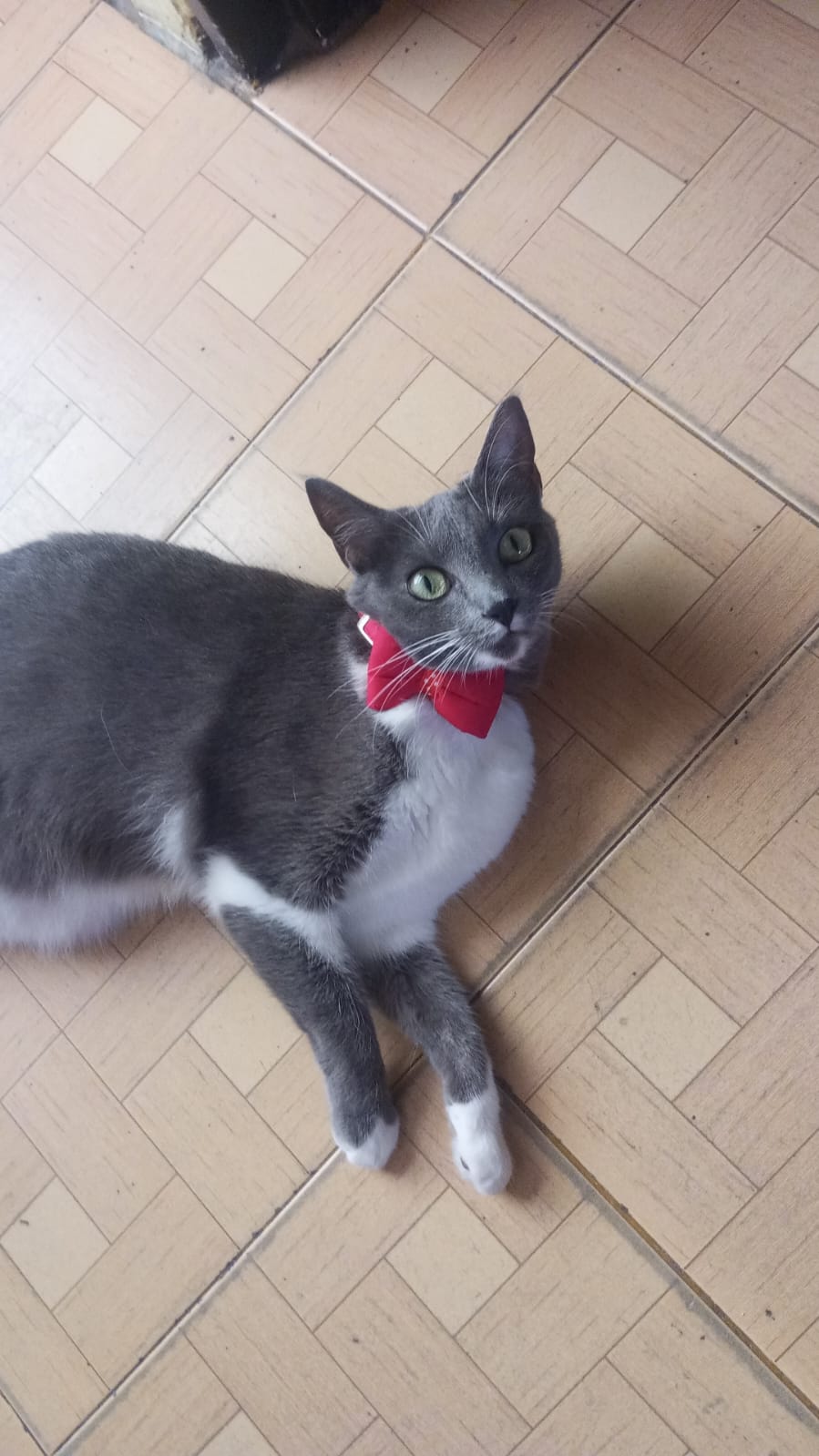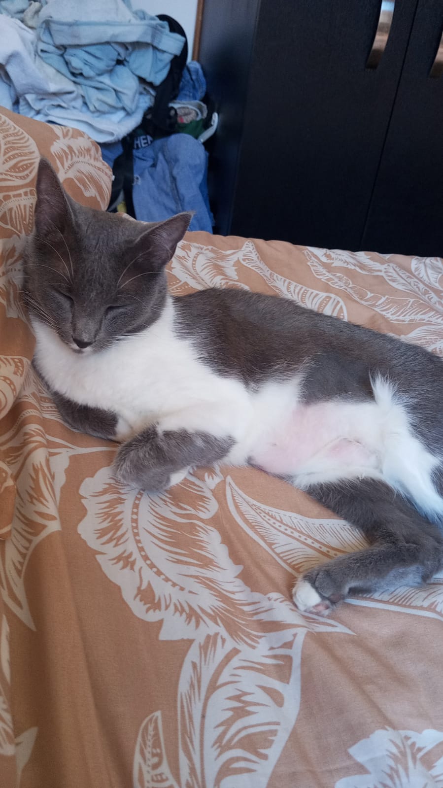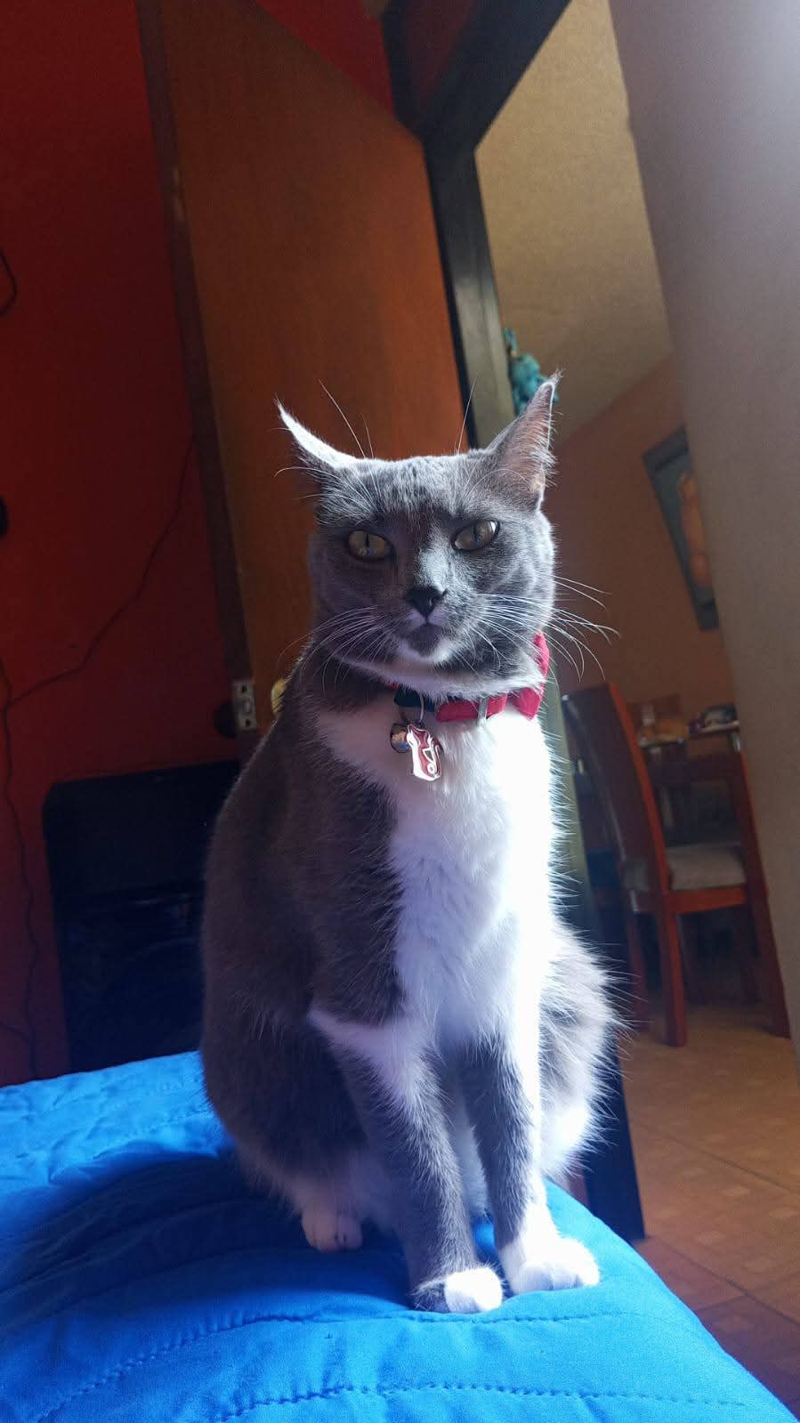 ✅ Es una gatita de pelaje gris oscuro por encima, por debajo blanco, zapaticos blancos, línea o brazalete blanco en la patita delantera derecha, ojos amarillos, puntito gris debajo de su mandíbula, cicatriz en el abdomen ya que hace dos meses fue operada de un cálculo en la vejiga. Tiene 4 años de edad y está esterilizada.