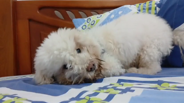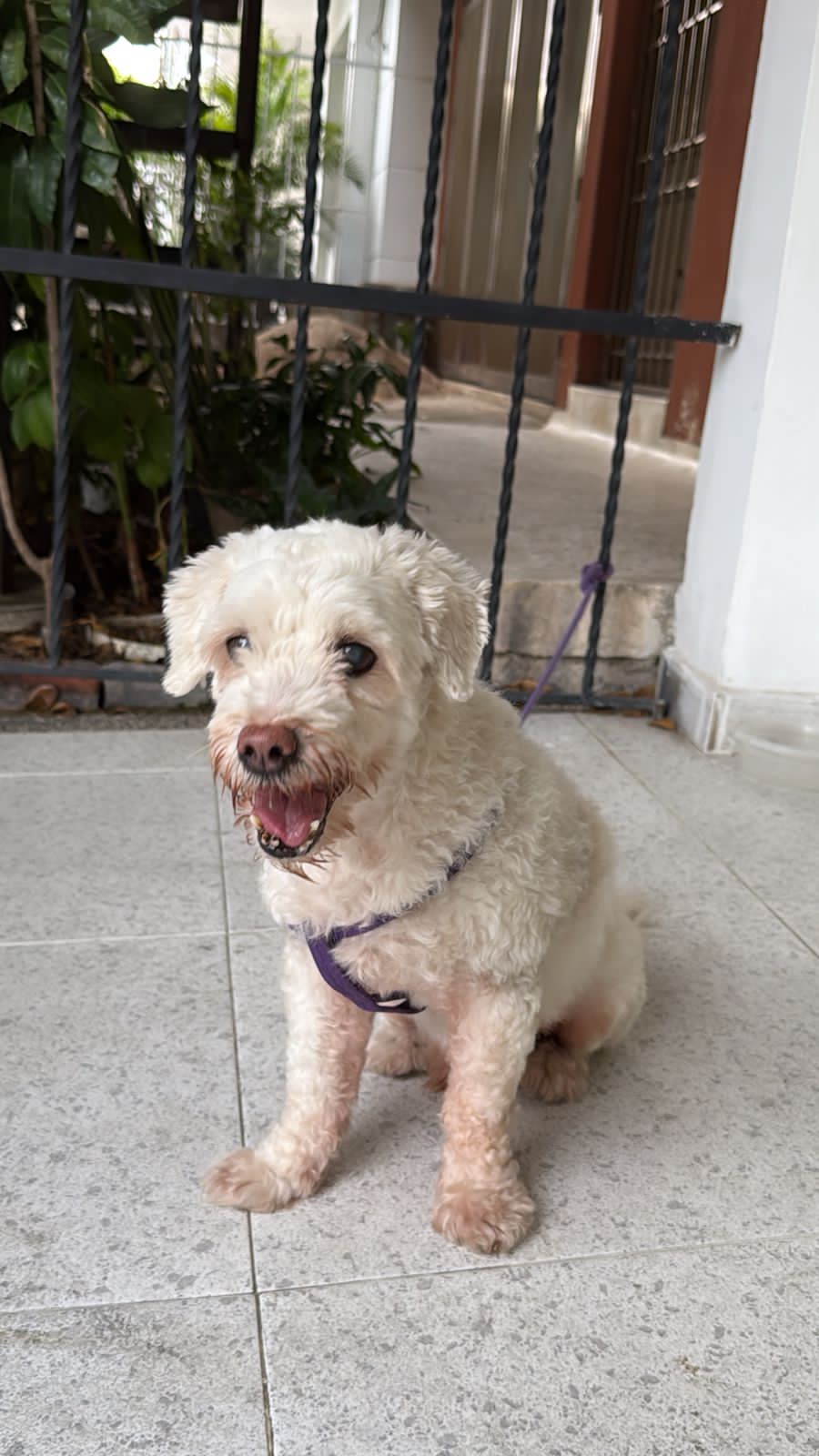 ✅ Es un perrito cruce de schnauzer con french poodle, es blanco, gordito, peludo, la boquita es oscura y su caminar es lento. Tiene 14 años de edad.