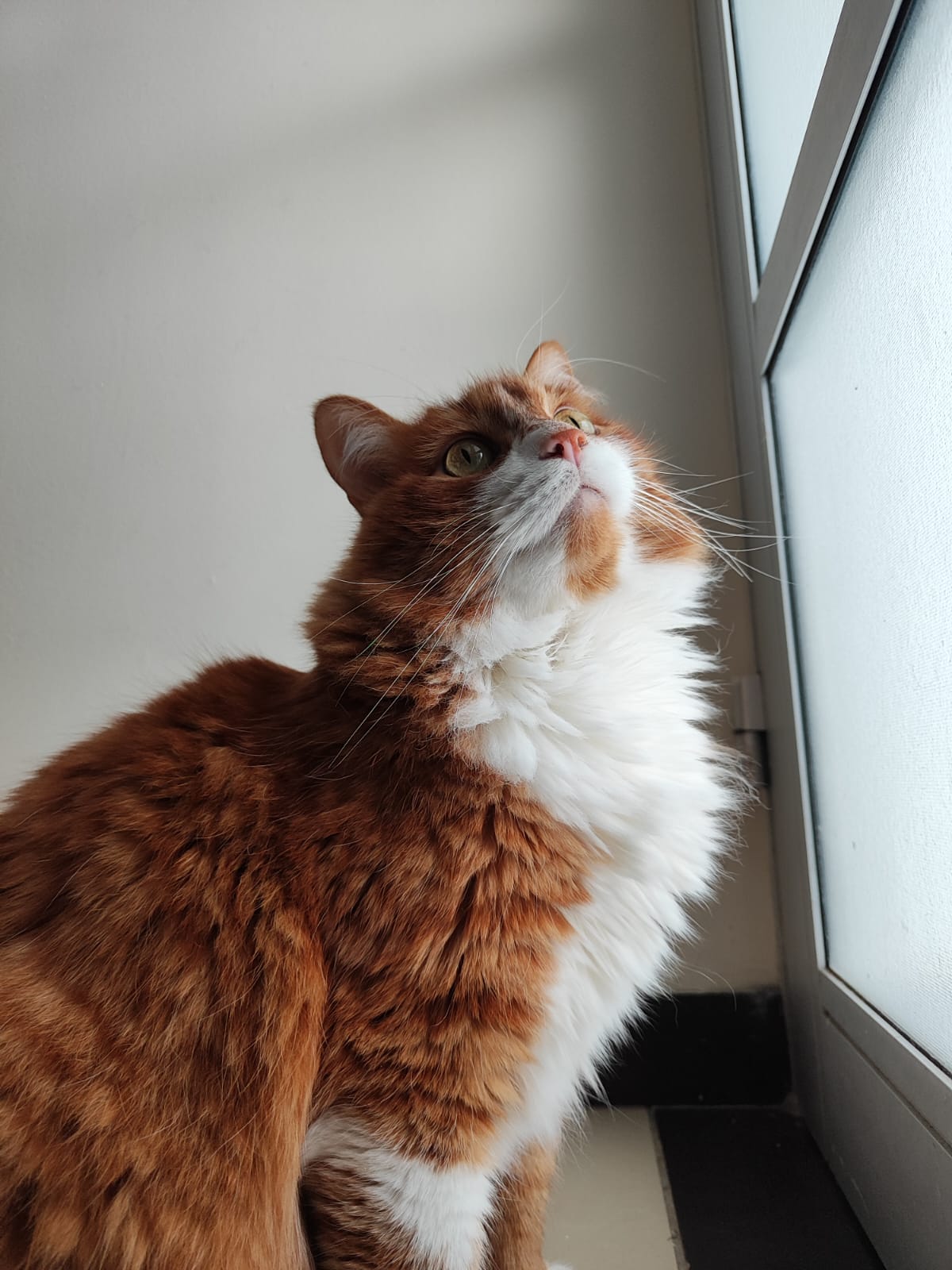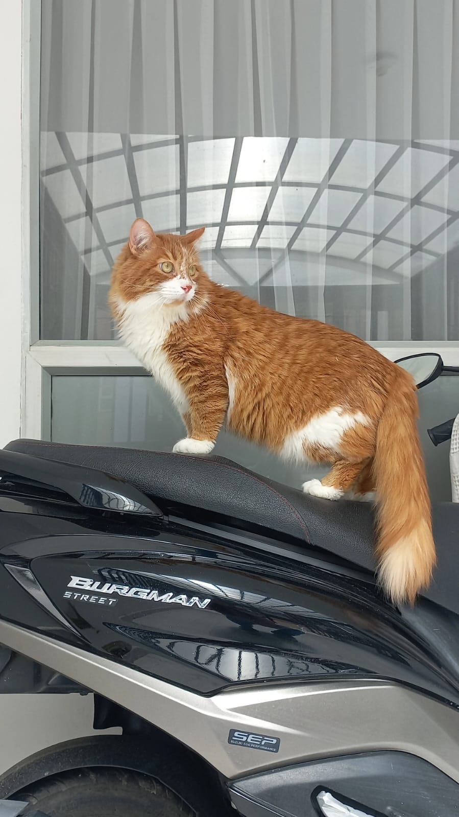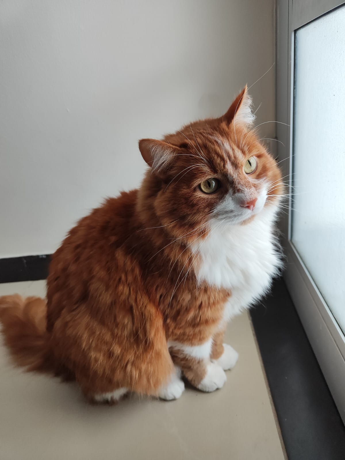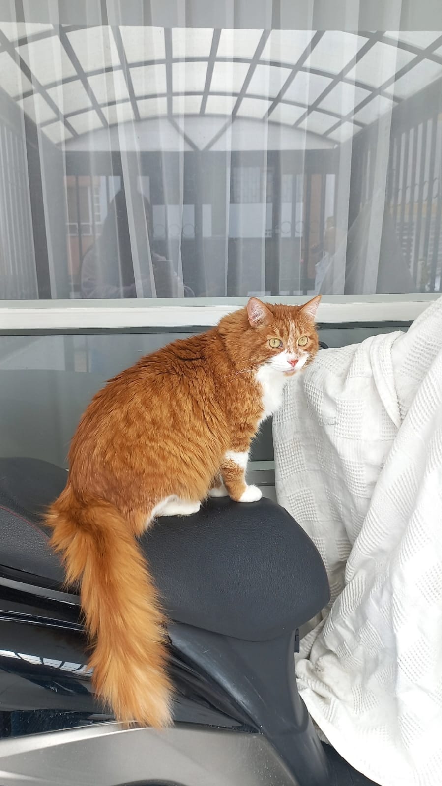 ✅ Es un gato naranja de pelo largo con el pecho y las patitas blancas, tiene su cola peludita, en su oreja derecha tiene un tatuaje en forma de C que es la marca de su castración (es una mascota de apoyo emocional). Tiene 6 años de edad.
