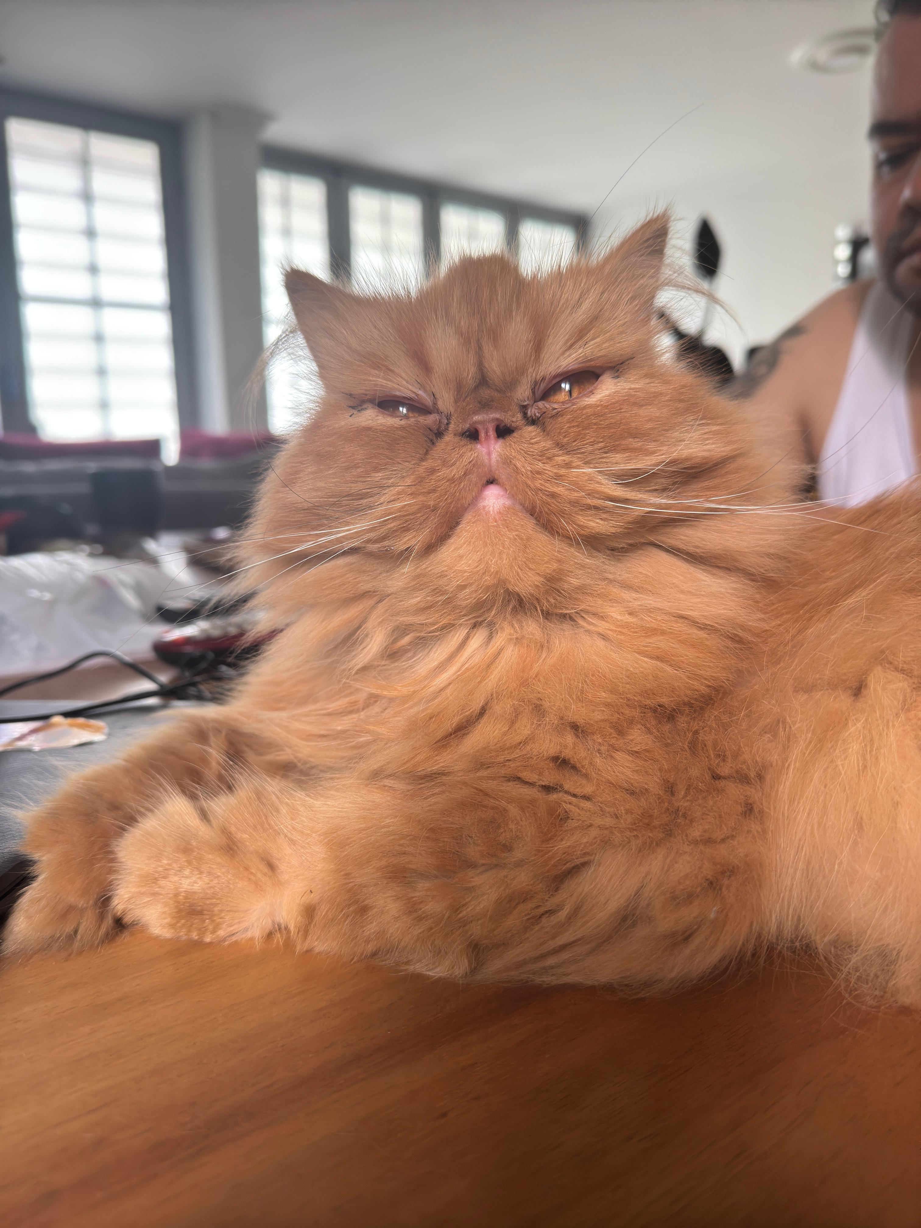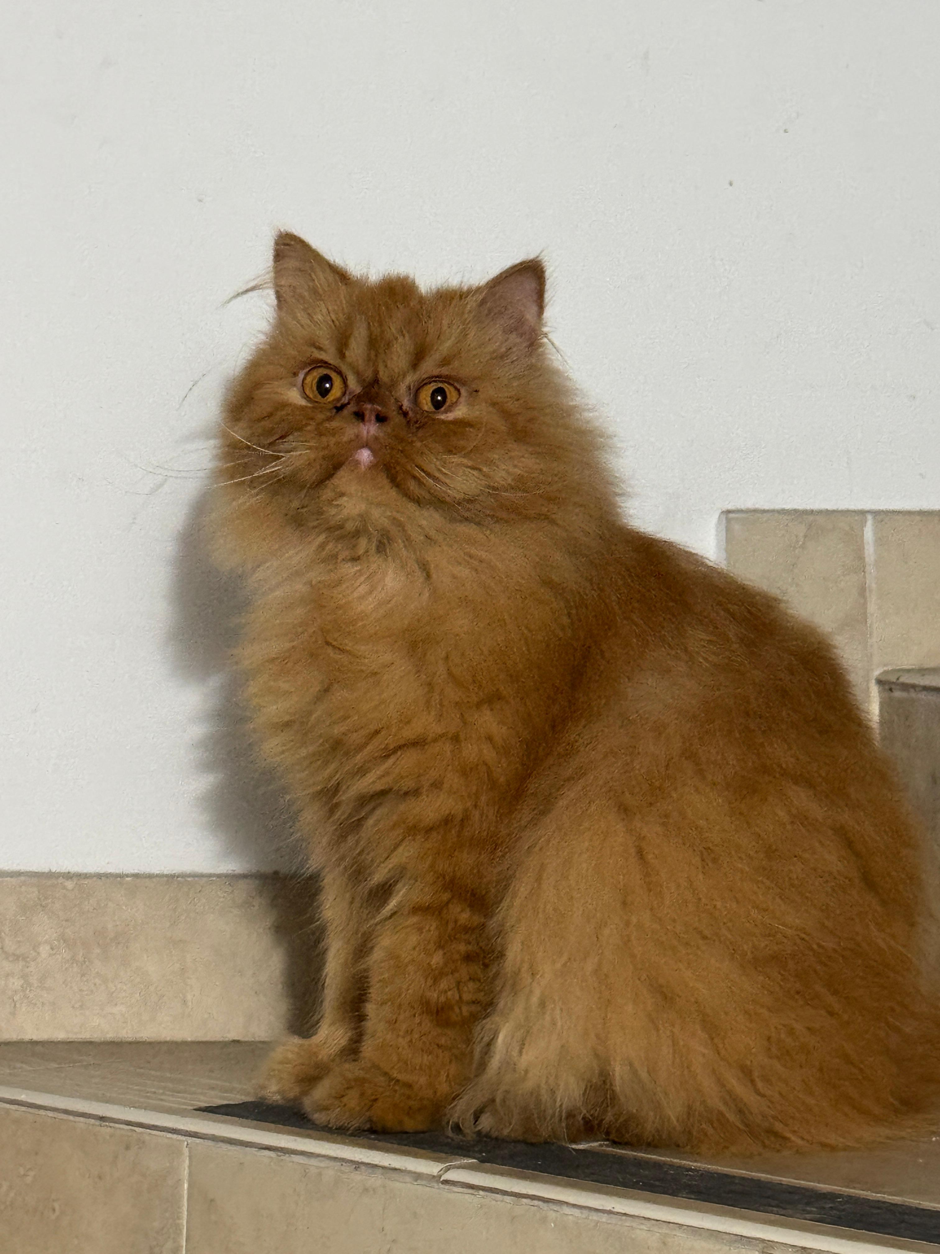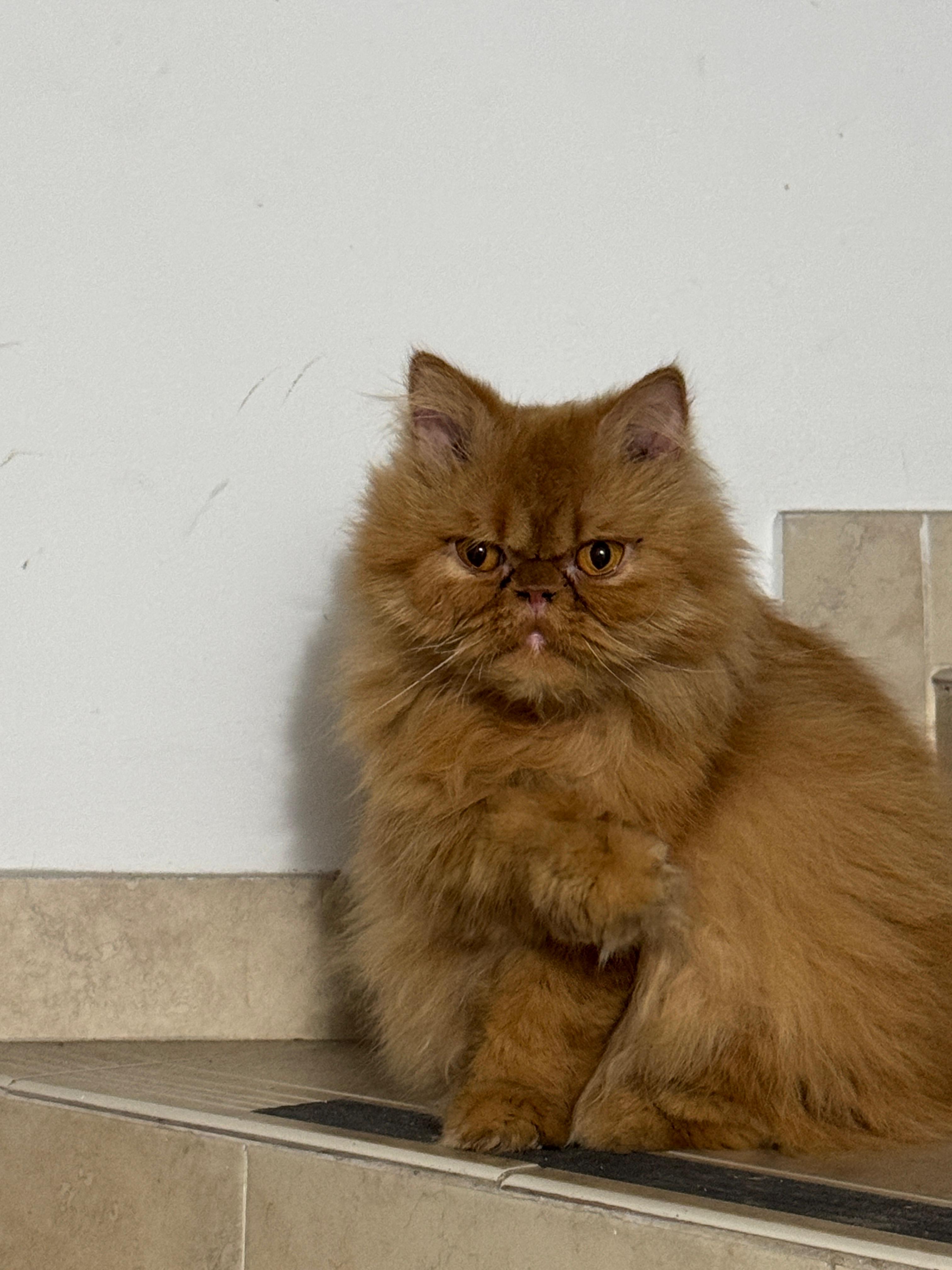 ✅ Es un gato persa amarillo/anaranjado, es gordo peludo. Tiene 5 años de edad y está esterilizado.