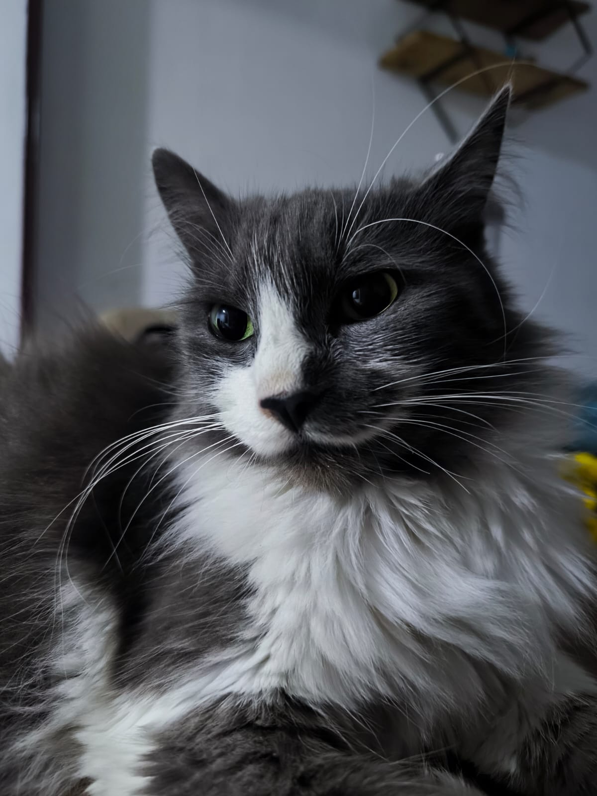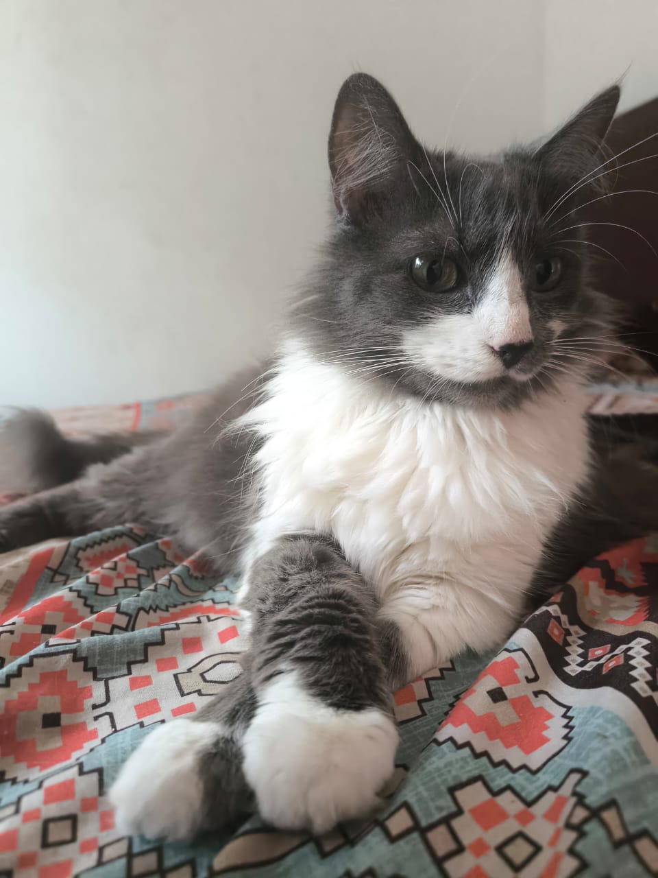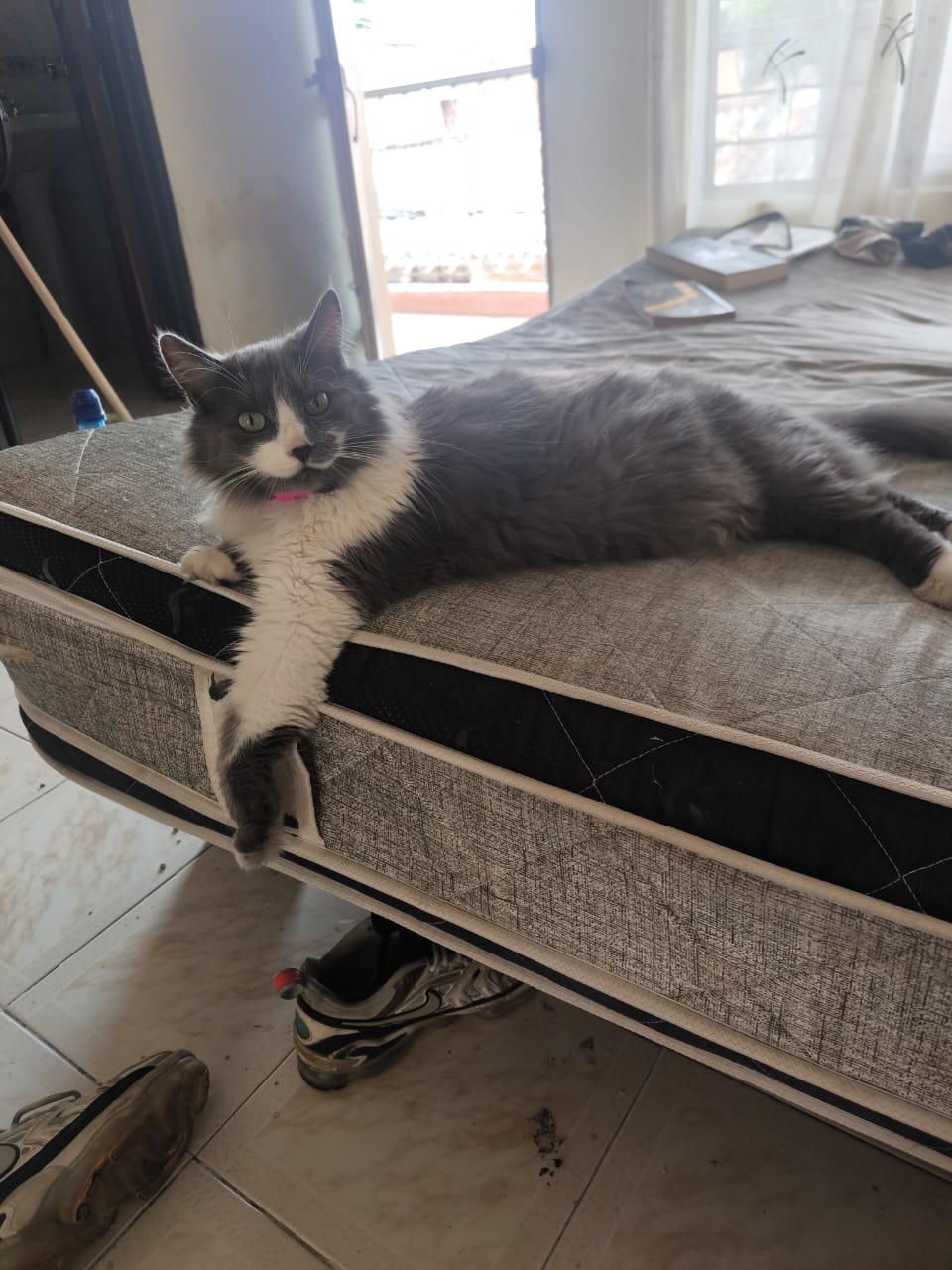 ✅ Es una gatita de tamaño mediano, gris con blanco y bigotes largos, es gordita, muy asustadiza. Tiene 4 años de edad y está esterilizada.