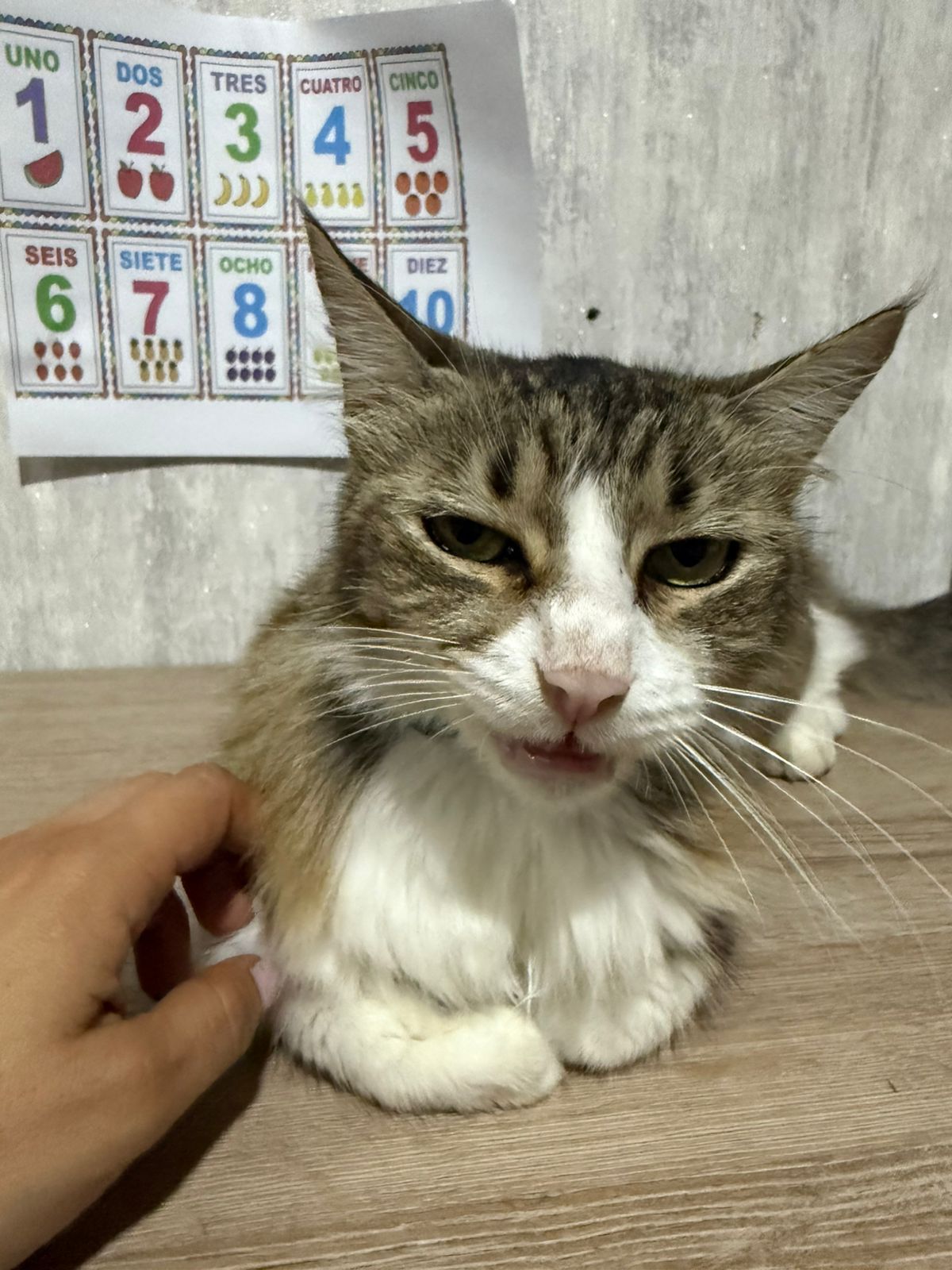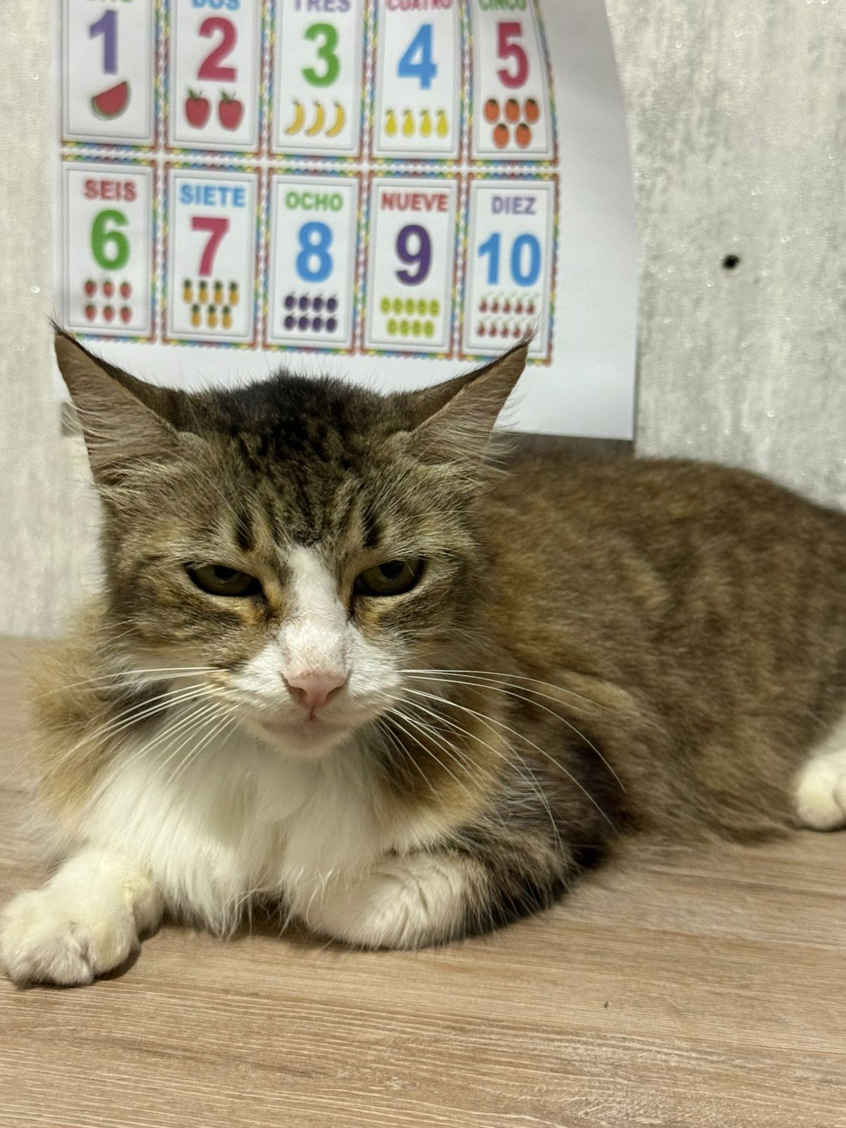 ✅ Es una gatica, hembra, es criollita, muy peluda, sus ojos son verdes, el pelaje es de color gris, blanco y marrón, tiene 3 años y es rescatadita de la calle