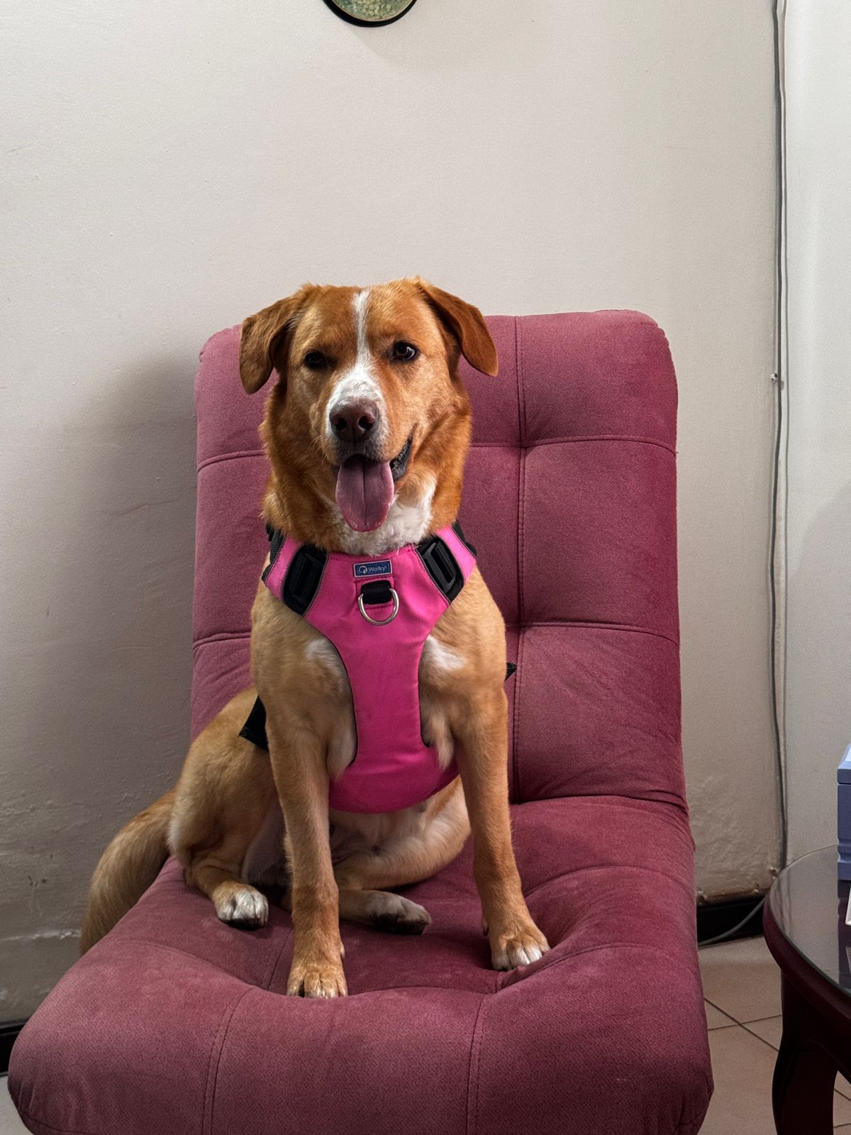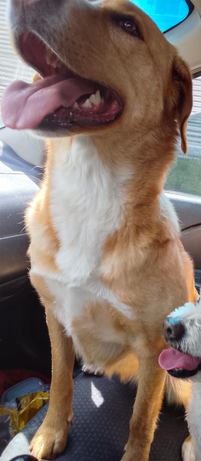 ✅ Es una perrita mestiza de color amarillo, con pecho blanco, de tamaño mediano. Tiene 2 años de edad y está esterilizada.