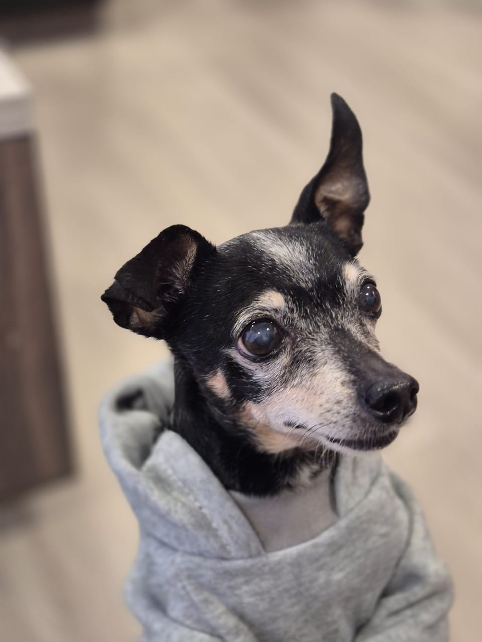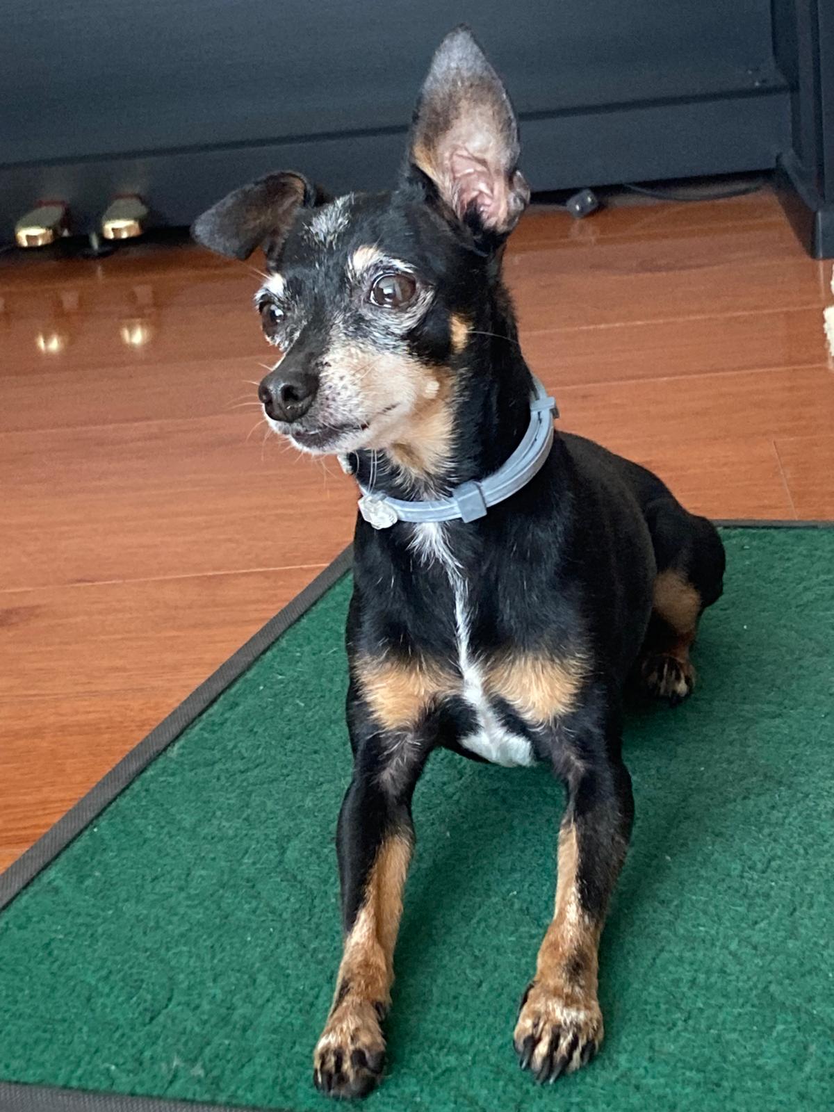 ✅ Es un perrito, macho, raza Pinscher miniatura, es negrito con el pecho café y blanco, es pequeño, mide de 25 a 30 cm de alto, es de figura esbelta, tiene una manchita de canas en la corona de la cabeza, canas al rededor de los ojos y hocico, su hocico es casi blanquito por las canas. Tiene cejitas cafés. Sus paticas son cafecitas y tiene la patica delantera derecha mas blanquita que las otras. Tiene usualmente la orejita izquierda parada y la derecha agachada, tiene el rabito cortado, tiene un chip de identificación, edad 14 años.