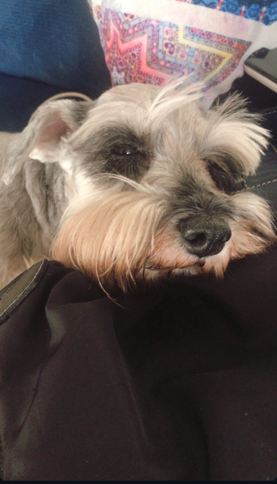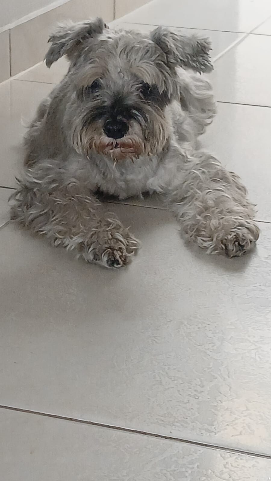 ✅ Es una Schannauzer de estatura mediana, color gris pimienta, tiene un lunar/berruguita negra al lado de la columna. Tiene 14 años y esta esterilizada