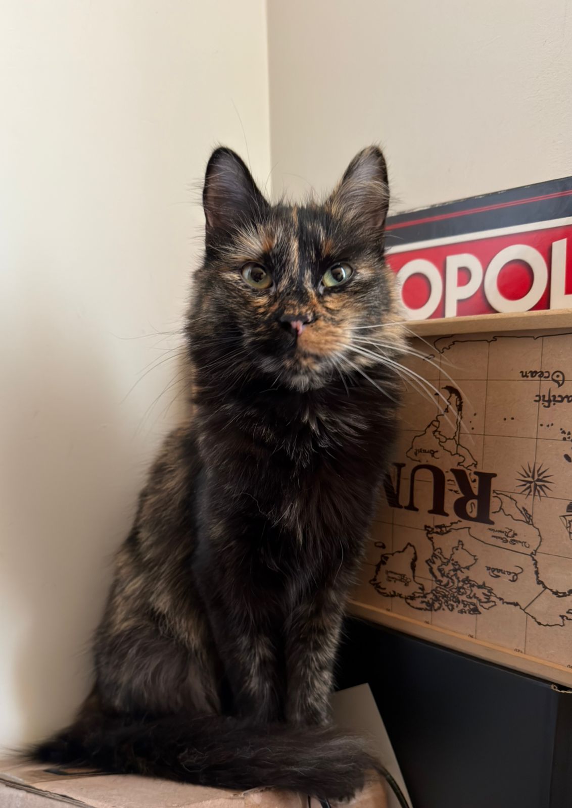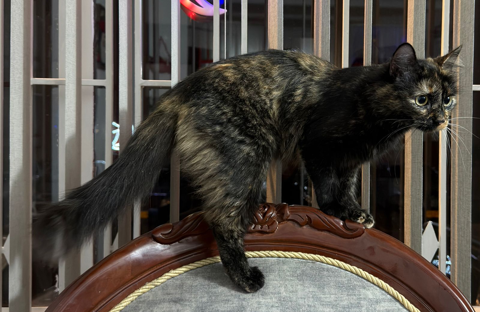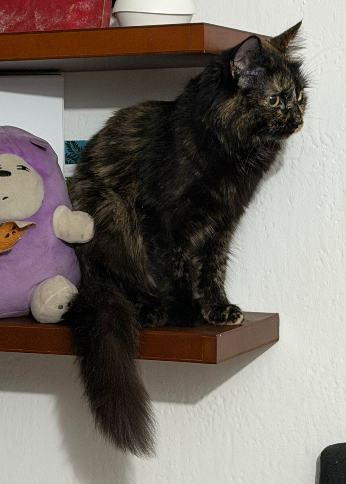 ✅ Es una gatita carey, negra con visos dorados de pelaje largo , cola esponjosa, es delgada. Tiene un año aproximadamente.