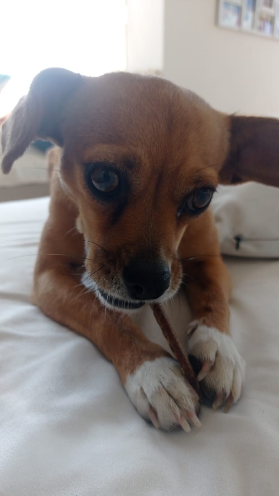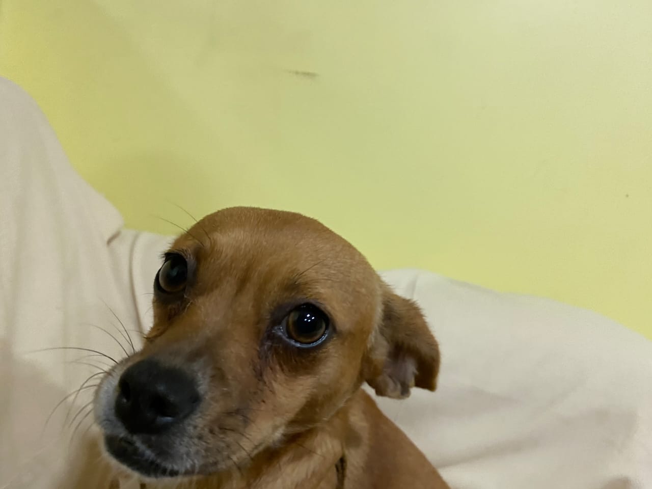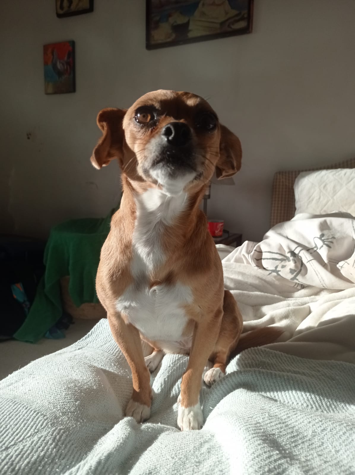 ✅ Es una perrita mestiza con cara de chihuahua color miel, pecho blanco y las puntas de la patitas también. Tiene 5 años de edad y está esterilizada.