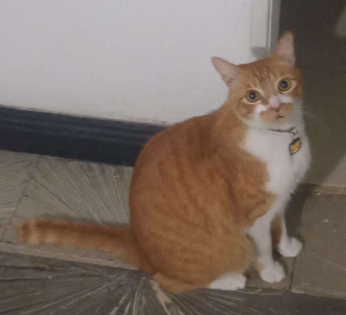 ✅ Es un gato criollo, naranja con blanco. Tiene una mancha naranja en su hocico. Es grande y tiene la cola un poco más corta con su punta doblada. Tiene 7 años de edad y está esterilizado