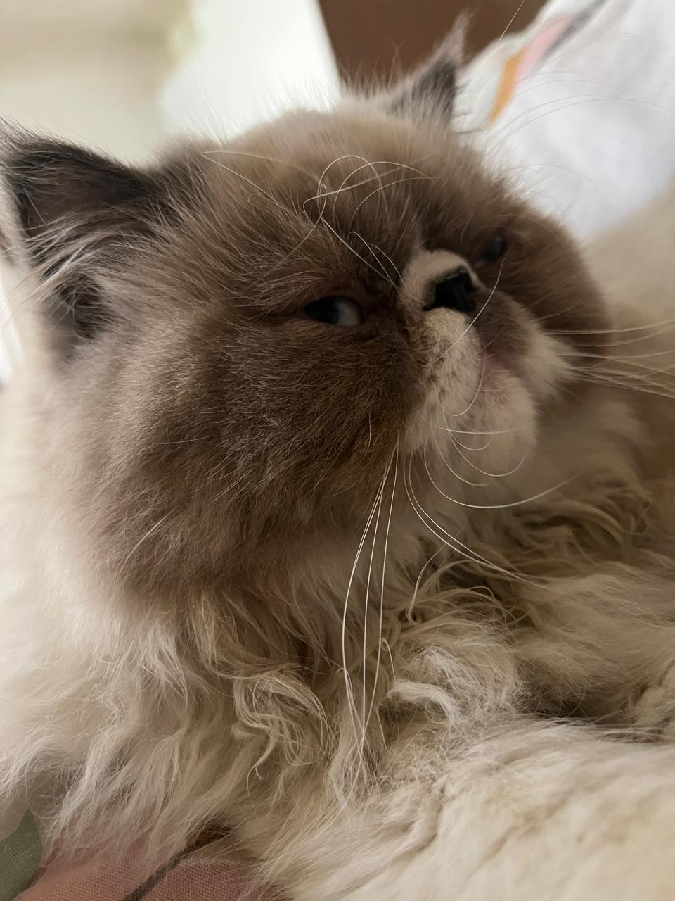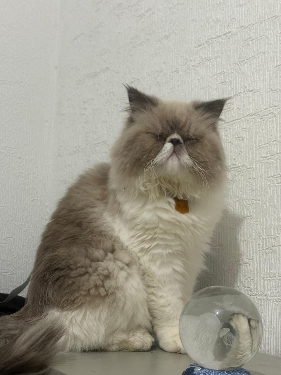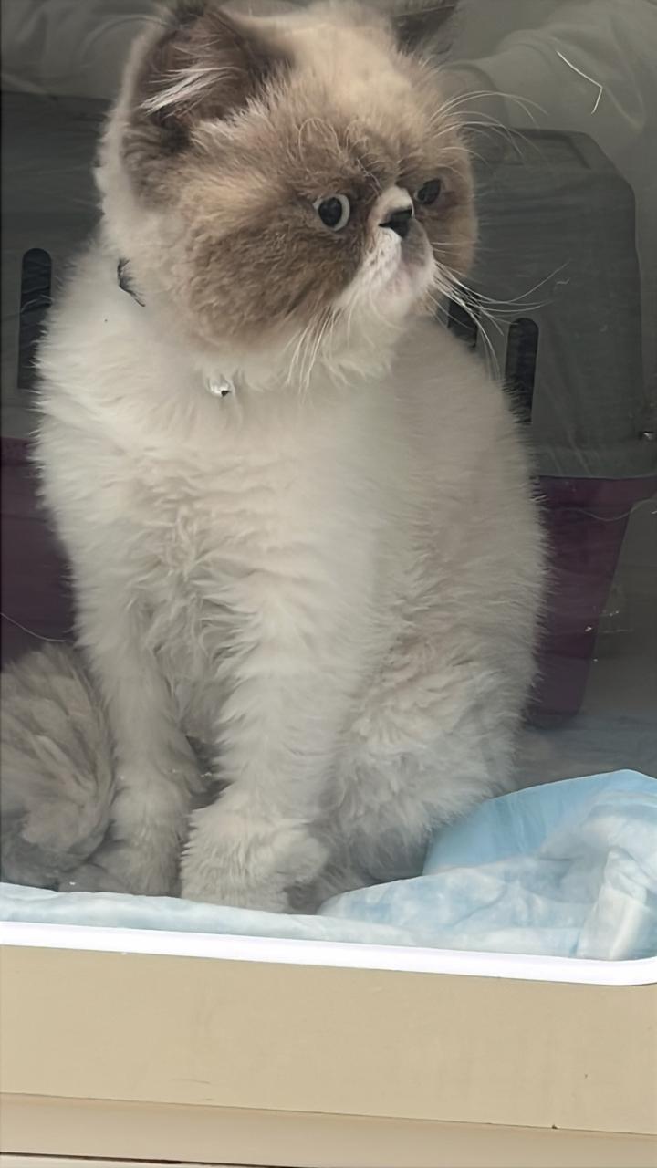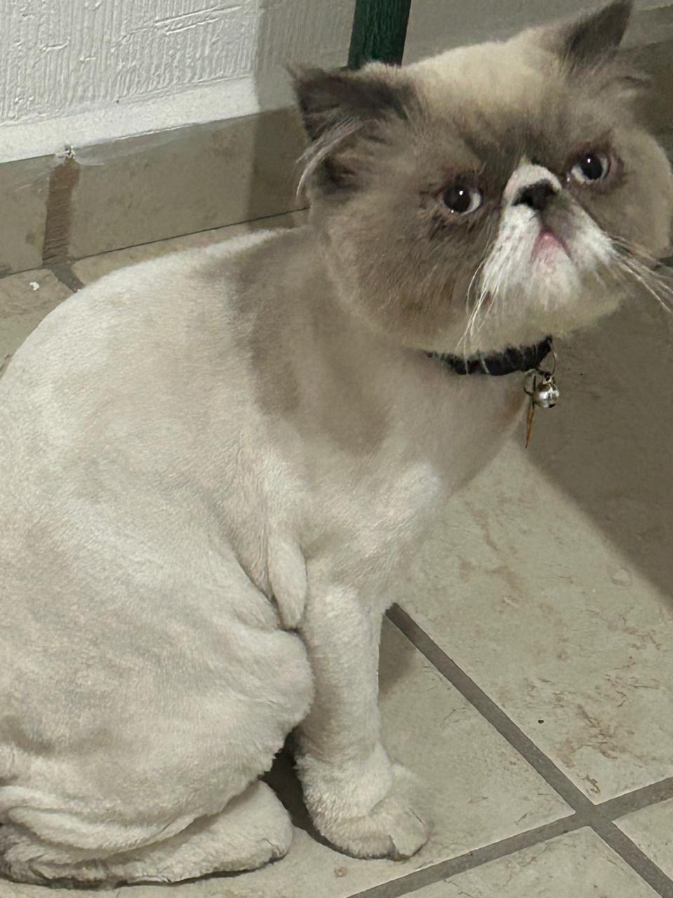 ✅ Es un gato de raza Persa, de clor gris con blanco, pelaje largo, cola esponjada, ojo azul claro. Tiene rasurado el cuello por dermatitis. Tiene ⁠2 años de edad y está esterilizado