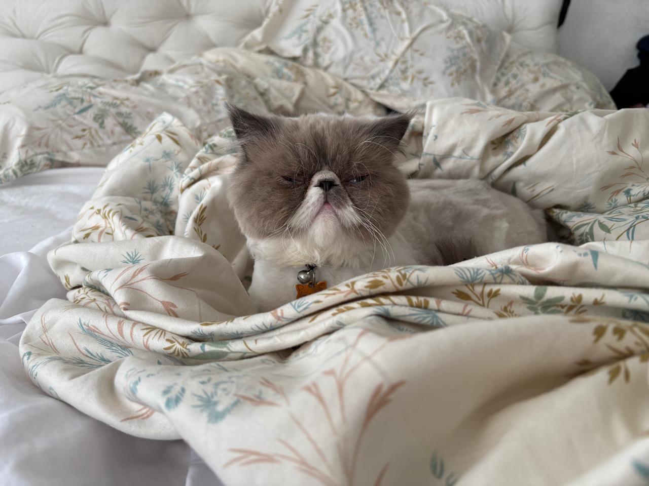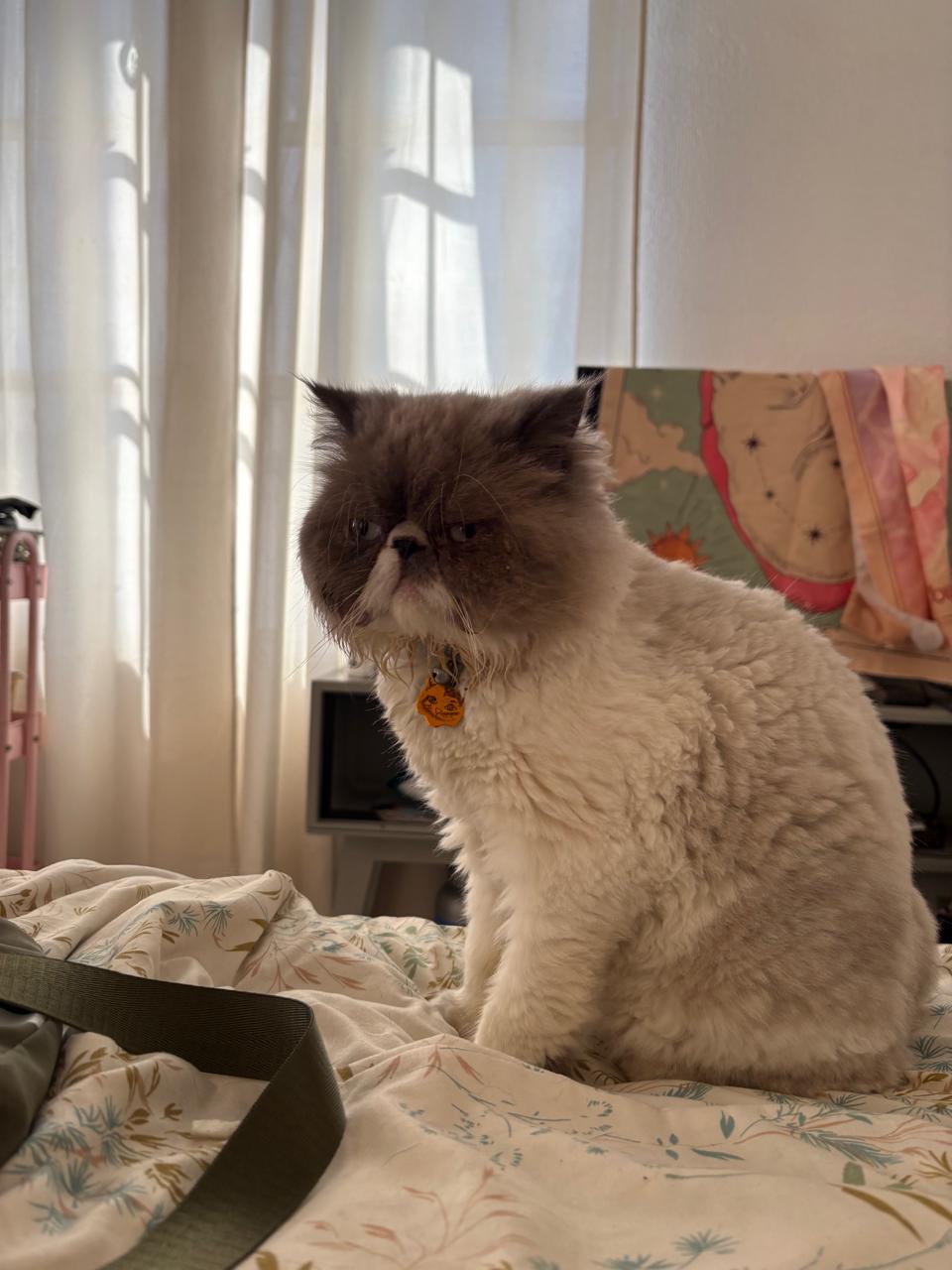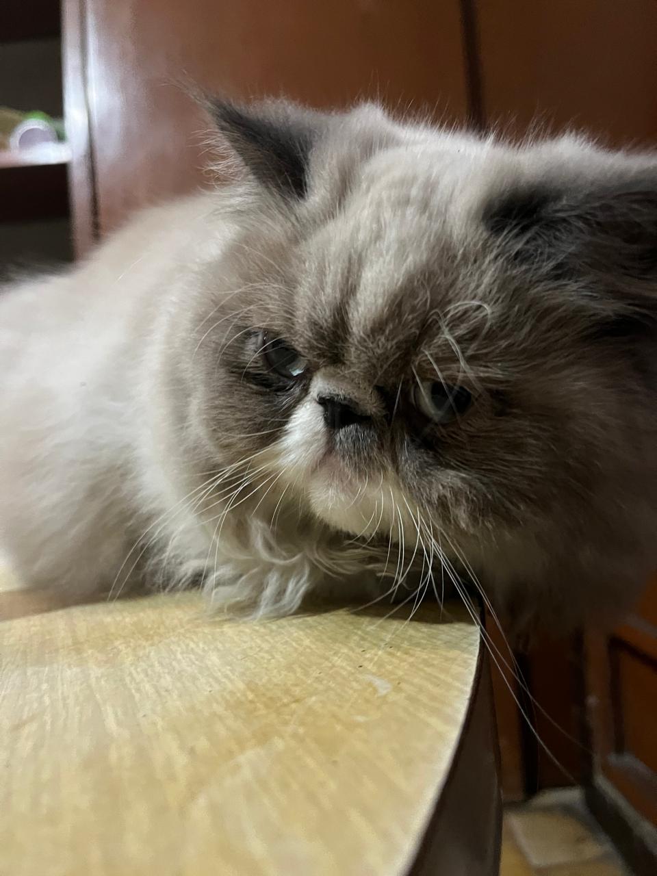 ✅ Es un gato de raza Persa, de clor gris con blanco, pelaje largo, cola esponjada, ojo azul claro. Tiene rasurado el cuello por dermatitis. Tiene ⁠2 años de edad y está esterilizado