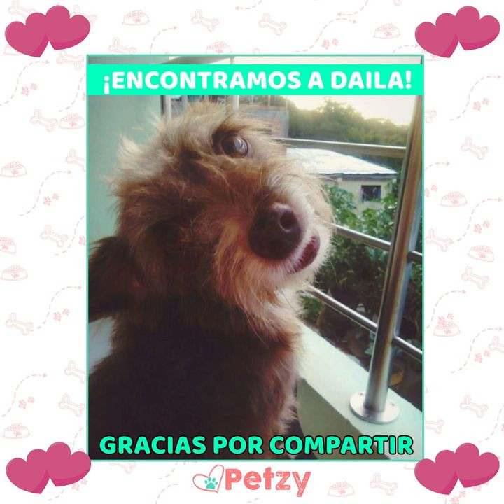 Gracias infinitas gracias a PETZY y a todas las personas que hicieron parte de esto que fueron las que difundieron la información nuestra princesa ROMELA ya está de vuelta en casa y está muy feliz y su familia también está muy feliz petzy es lo mejor en búsqueda de peluditos y animalitos los súper recomiendo