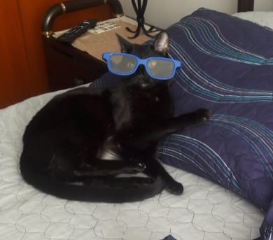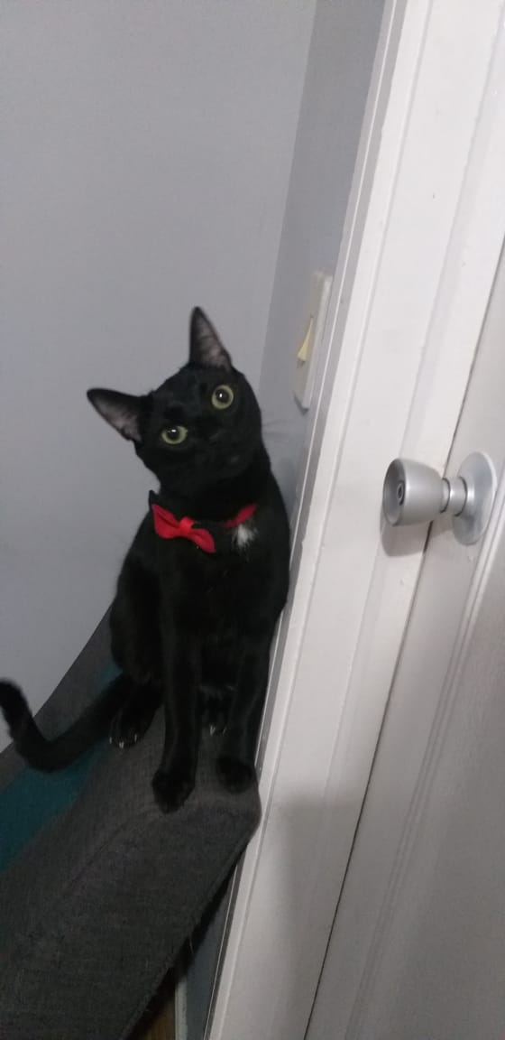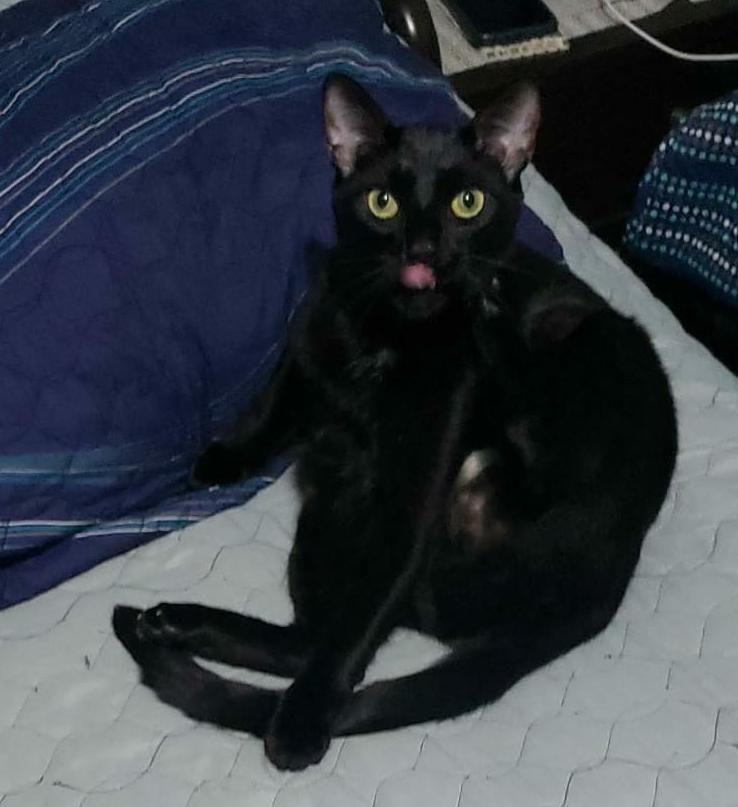 ✅ Gato negro con dos manchas blancas en forma de triángulo en el pecho y la barriga, es delgado, tamaño grande, cola larga, ojos verdes, pelo corto, orejas grandes.
