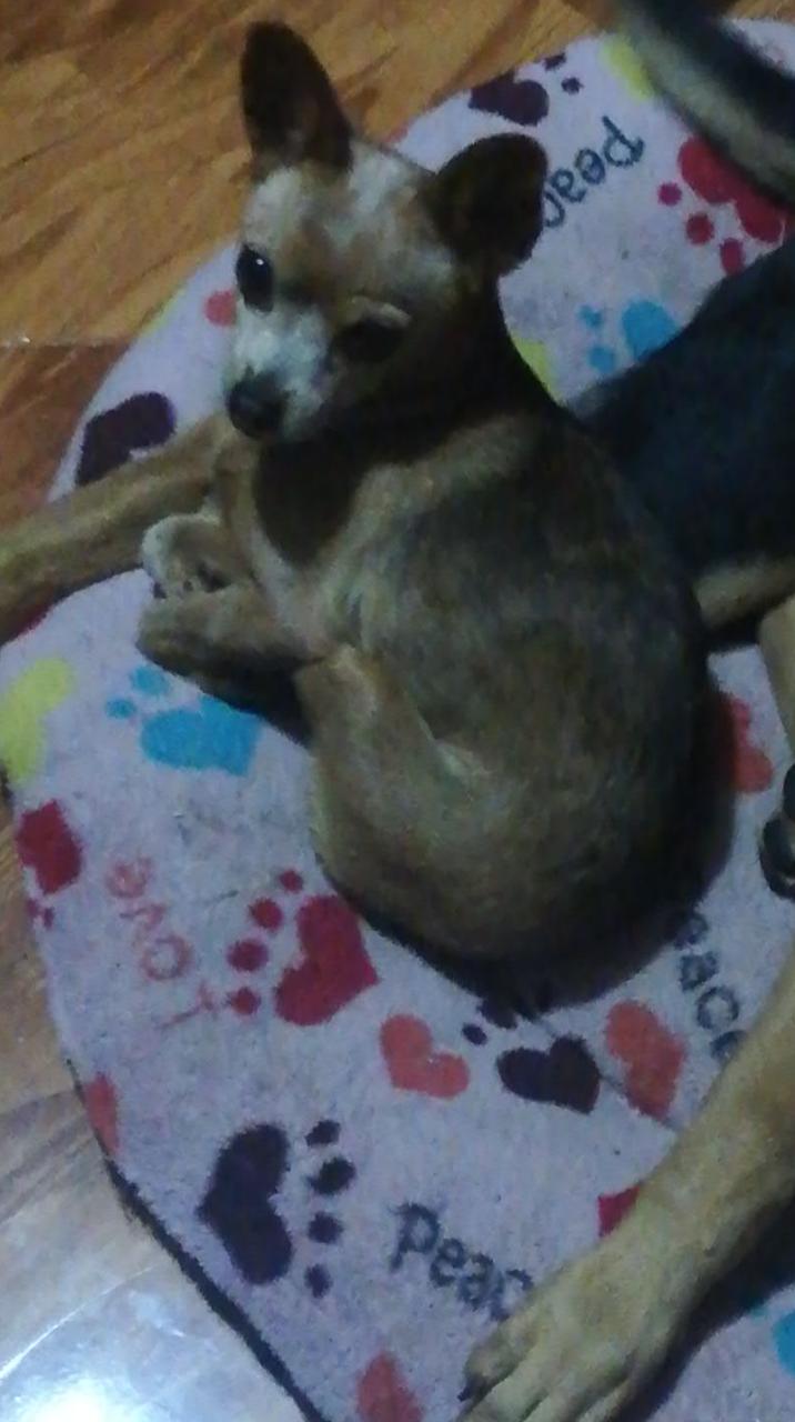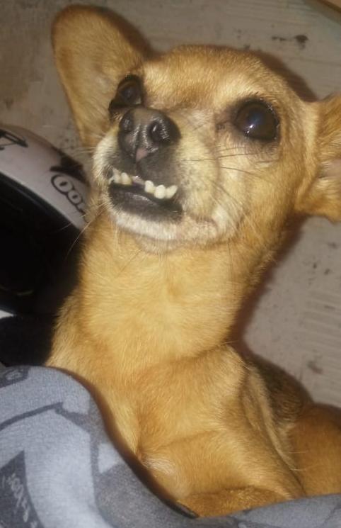 ✅ Es pequeña, color café claro, la carita ya se le estaba poniendo blanca por que ya está viejita y no tiene casi dientes, no tiene cola.