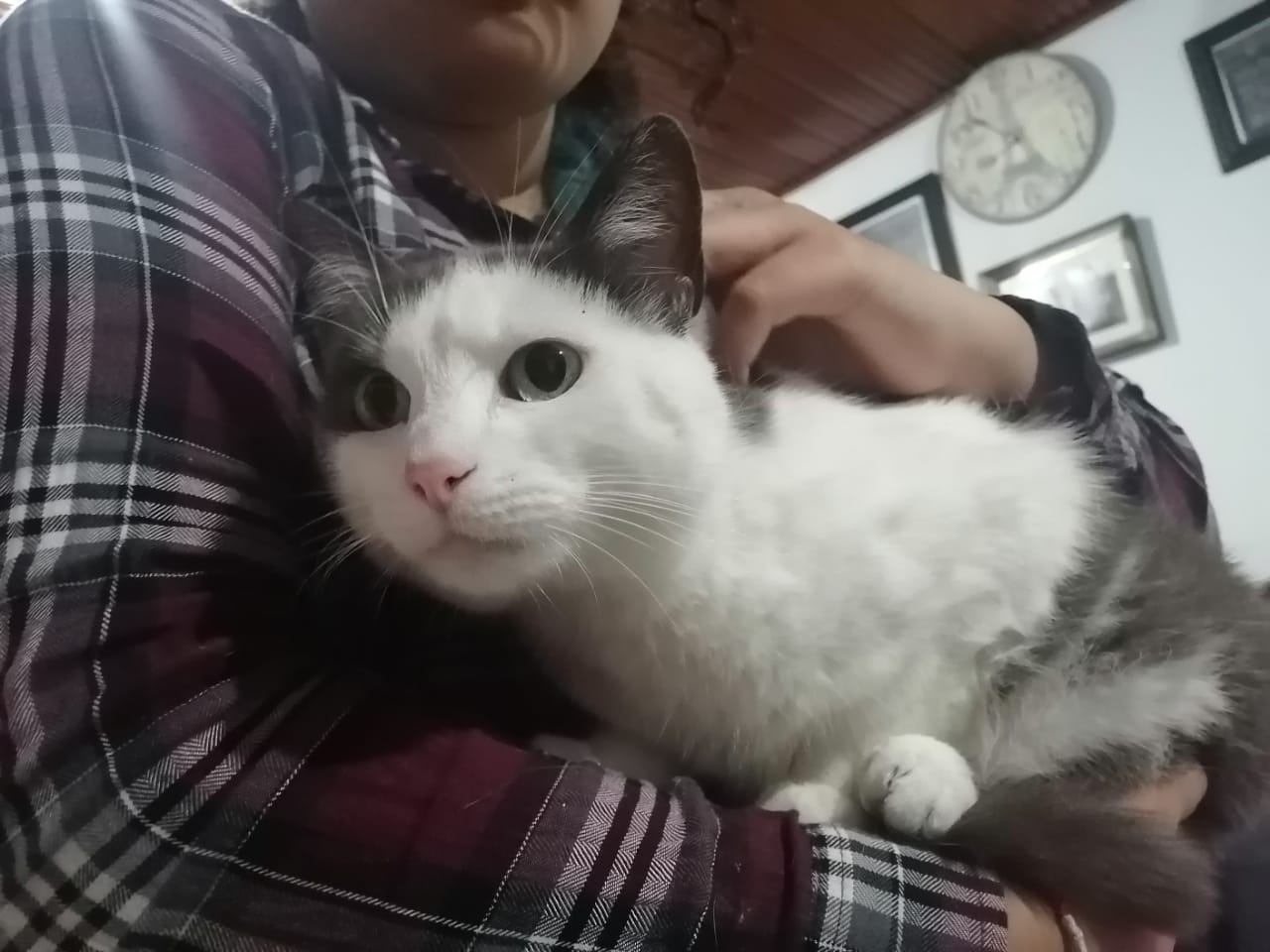 ✅ Color gris con blanco, tamaño mediana, cola larga gris, su pelo es corto, la cara es blanca con una mancha gris en la parte del ojo derecho.