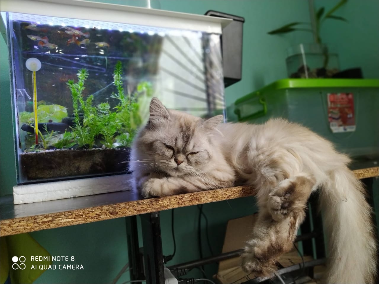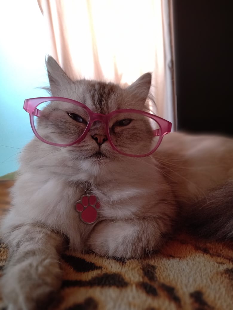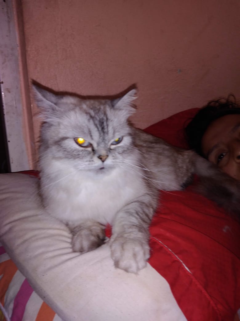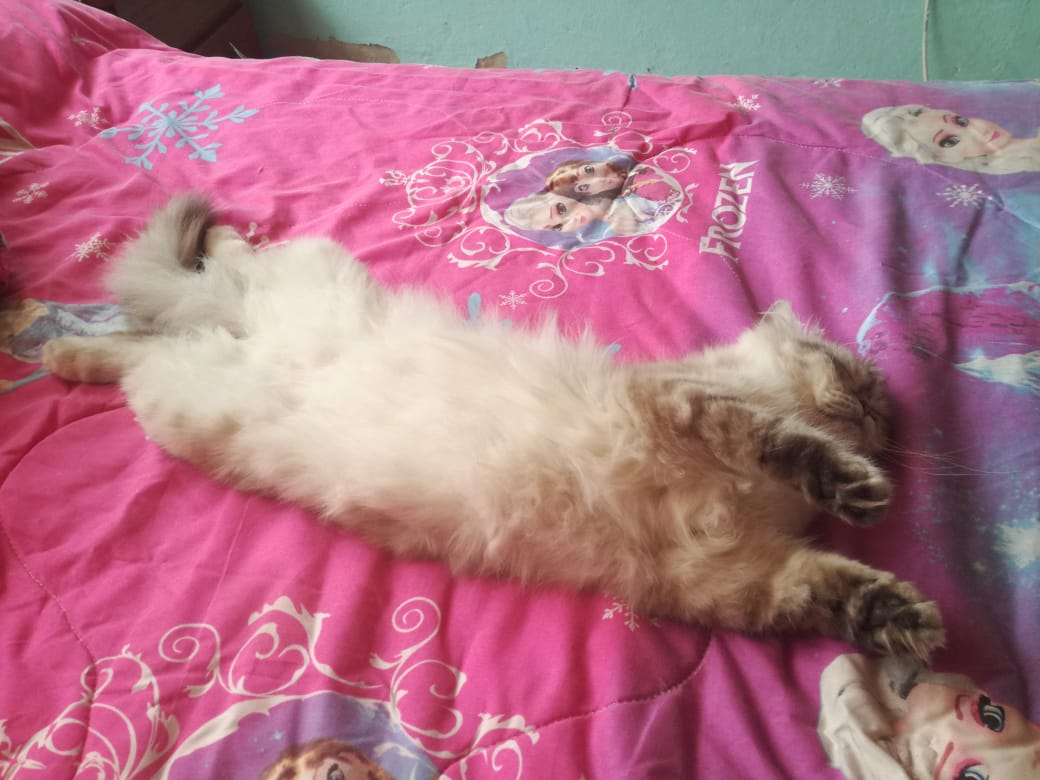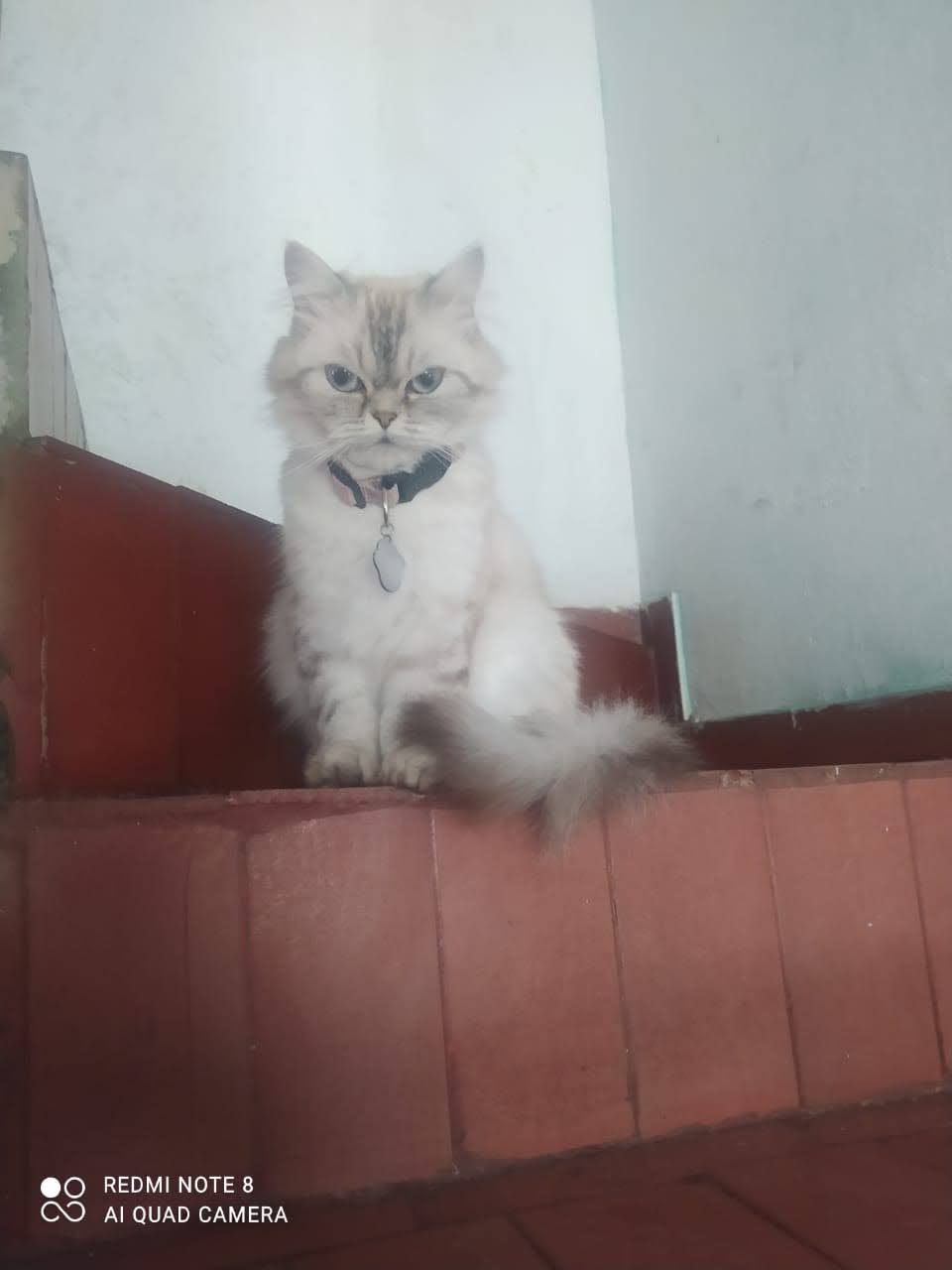 ✅ Es blanca de lineas cafe, cola larga esponjada, cara chata y redonda, pelo abundante peladita en el lomo y la base de la cola por que se rasca.