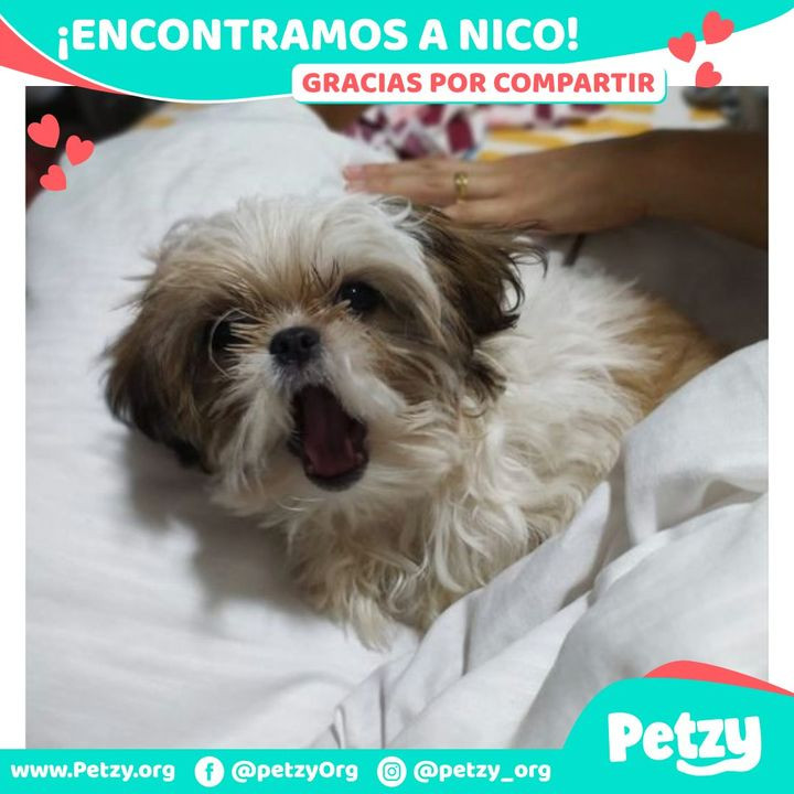 ¡Tenemos excelentes noticias! 👏🏼 Con la ayuda de la difusión masiva de la noticia de la pérdida de Nico 🐕 ha sido posible que haya sido recuperado y devuelto a su familia 🥳 ❤️ y claro, todos estamos celebrando que esté de vuelta en casa 🤗 muchas gracias por ayudar a difundir 🎉