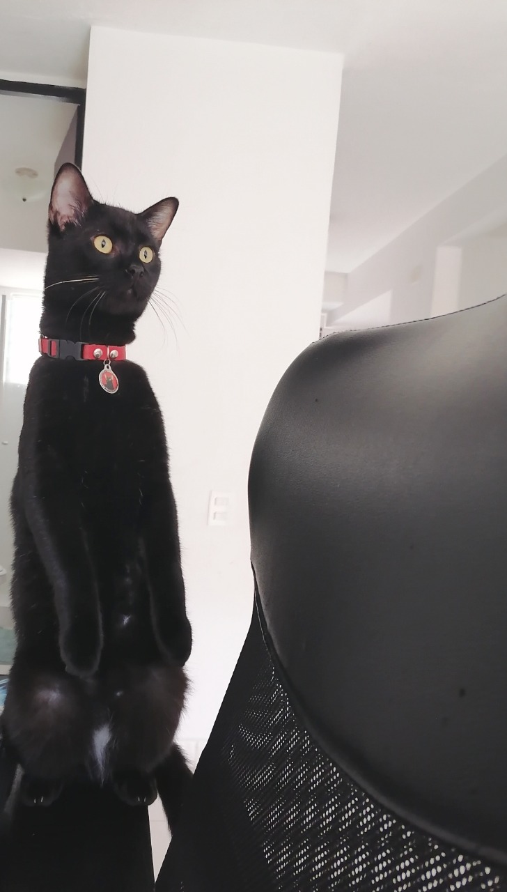✅ Es un gato macho de pelaje negro algunos pelitos son blancos (como si tuviera canas), es de pelo brillante y abundante, cola larga, tiene dos calvitos en la frente. En la parte de abajo de su pancita, bien abajo tiene una mancha blanca. Responde al nombre es decir uno lo llama y el viene inmediato, es muy cariñoso, semi gordito.
